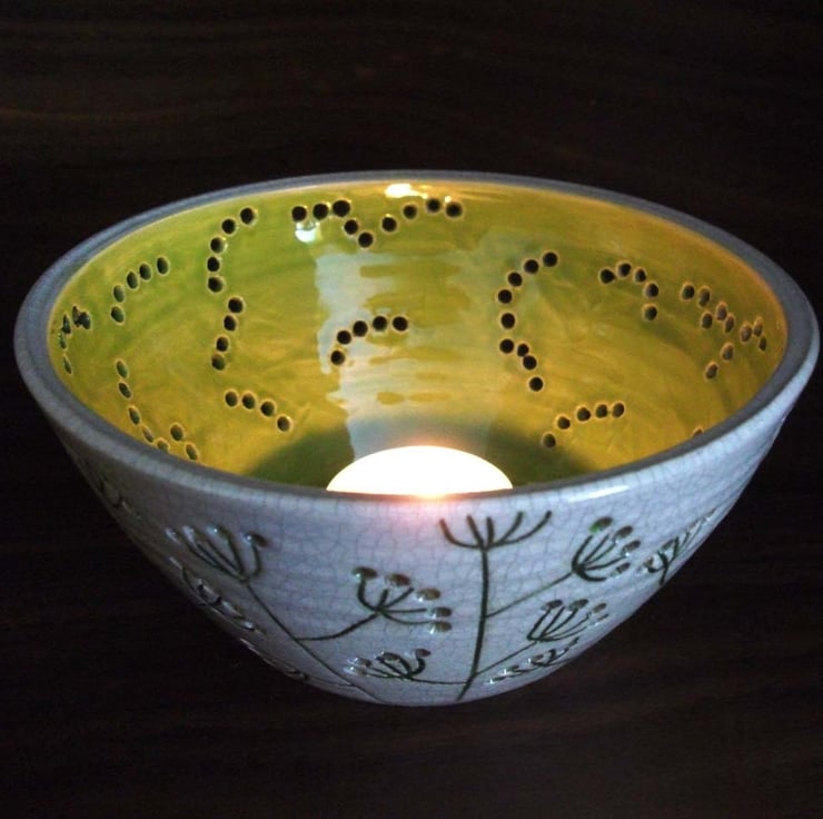 It has been decorated with a floral decoration and holes pierced through the body. This can be used with a votive to create subtle lighting.