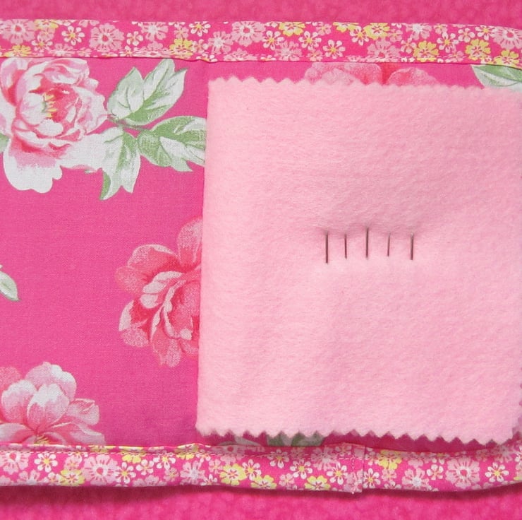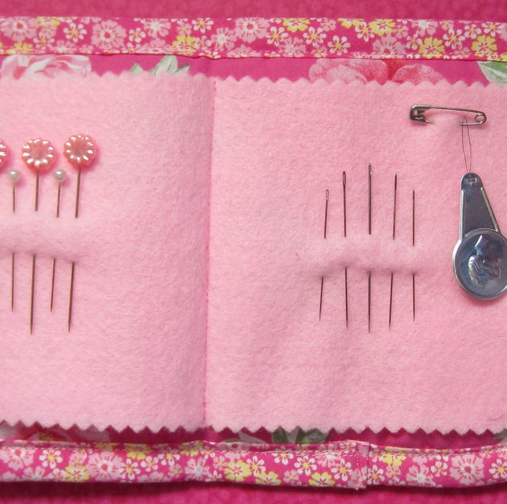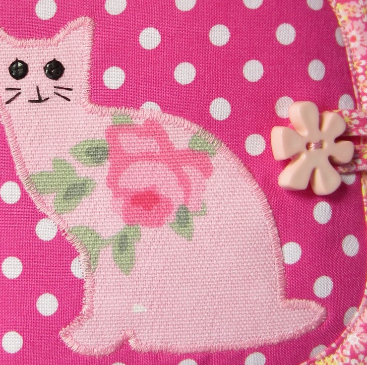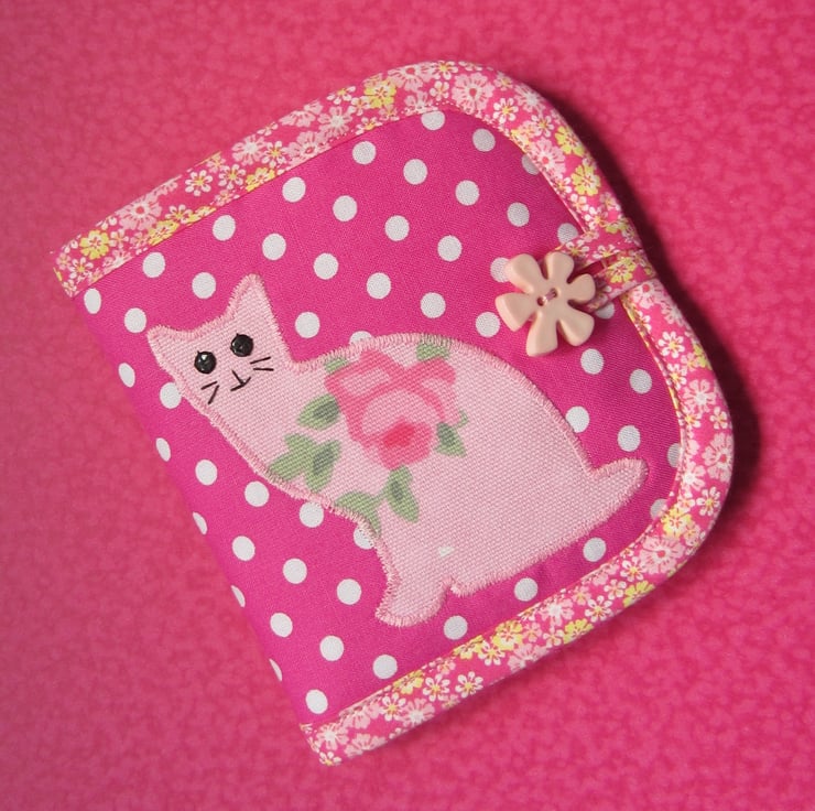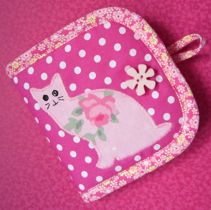 Padded pink and white spot needle case appliqued with a cat that has black sequin eyes and hand sewn features. Backed with pink floral fabric and edged with a small pink floral bias binding. Inside there is a pink felt page complete with pins, needles and a threader. Fastens with a loop and a flower button.