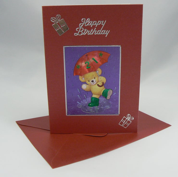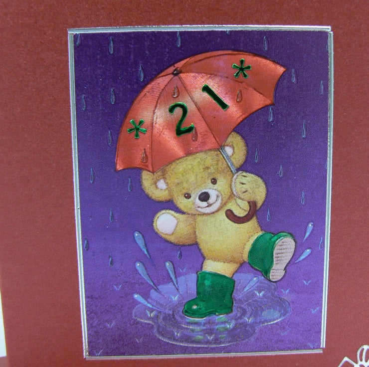 A cute little Dufex foil card featuring a teddy bear in green wellies splashing about in the purple rain! The card is blank inside for you to write your own sentiments, measures 10.5 cm x 14.5 cm and comes with matching red metallic envelope and cellophane bag.