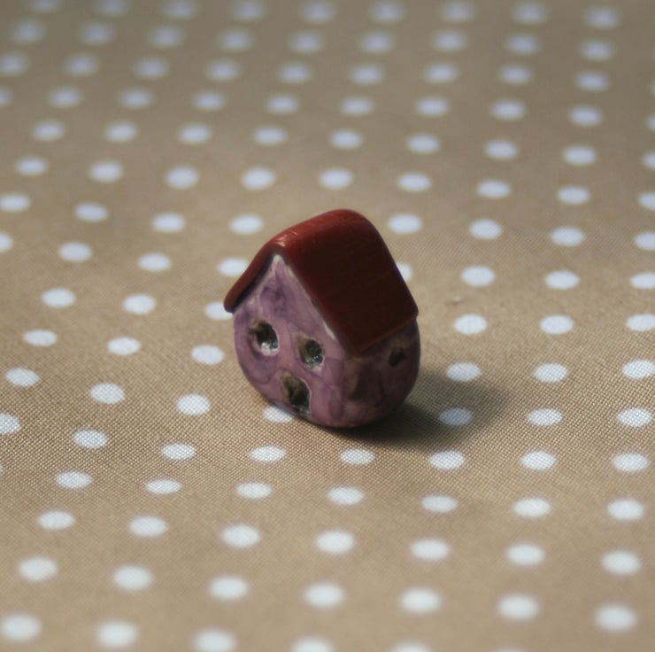 A little country cottage bead painted with a purple acrylic wash. The roof is a copper bronze colour and lightly textured. The bead is handcrafted from polymer clay, hand painted and finished with a protective coat of varnish.