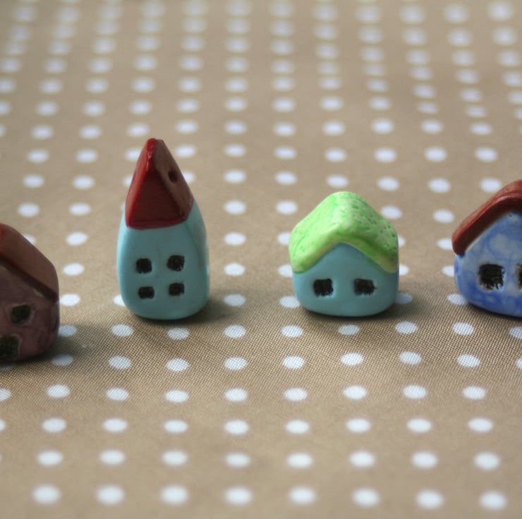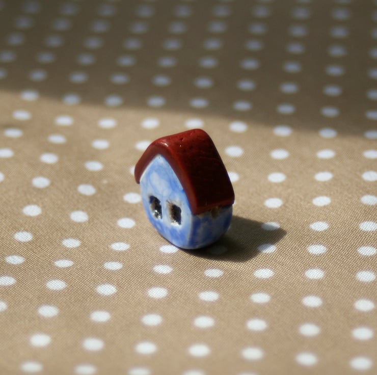 A little country cottage bead painted with a blue acrylic wash. The roof is a copper bronze colour and lightly textured. The bead is handcrafted from polymer clay, hand painted and finished with a protective coat of varnish.