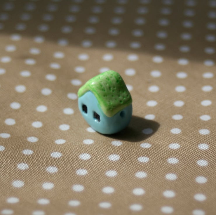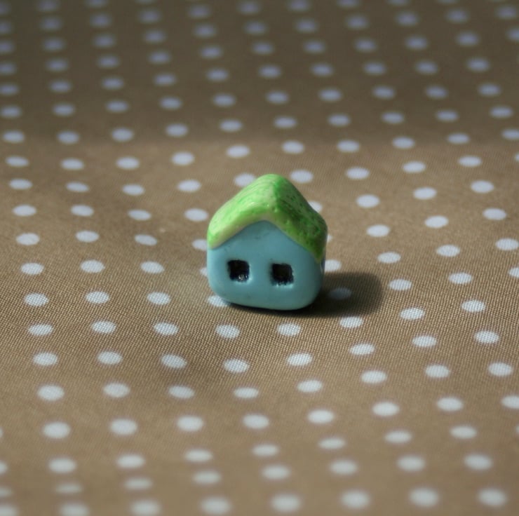 A little country cottage bead handcrafted from aqua coloured polymer clay. The roof is hand painted with a lime green acrylic wash and lightly textured. The bead is finished with a protective coat of varnish.