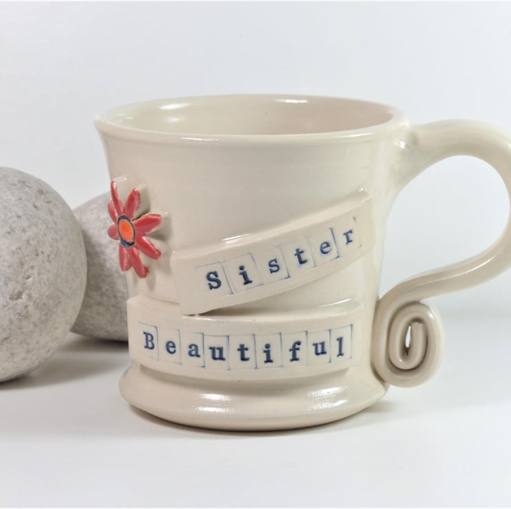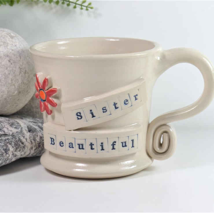It has the words 'Sister Beautiful' stamped into raised clay on the side of the mug with the addition of a red flower.