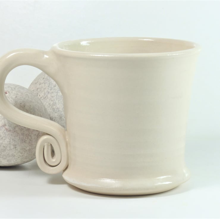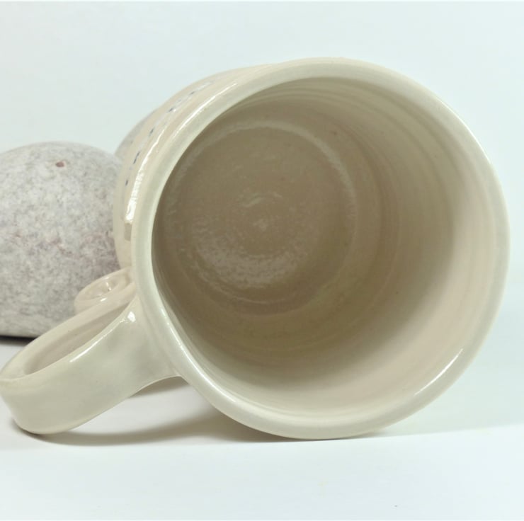 I threw this mug on the potter's wheel using a white stoneware clay. I then turned the base and added the handle and decoration before bisque firing the mug. I glazed it using a lovely transparent glaze and again fired it, this time to 1240C stoneware making it strong and durable.