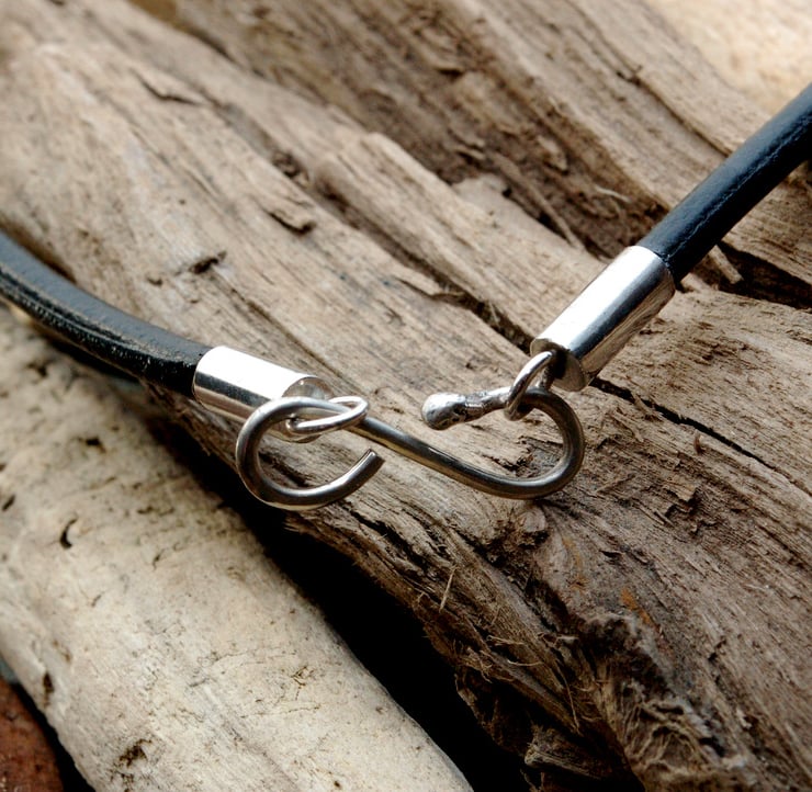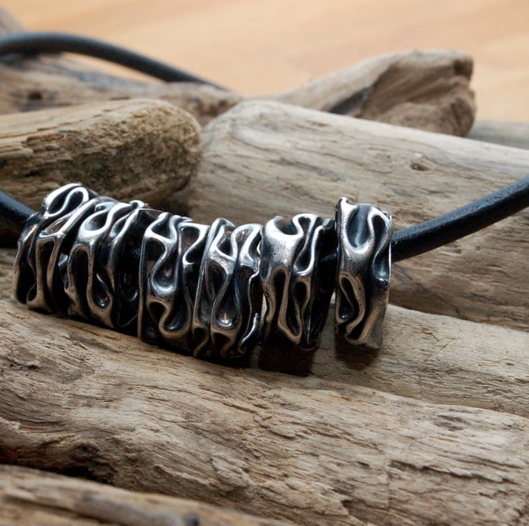5 beads have been made from sterling silver sheet which has been 'squashed' to form a folded effect. Each bead has then been oxidised and the edges polished to bring out the texture. The beads are strung onto 4mm leather with handmade sterling end caps and an S hook for fastening. An unusual and eyecatching piece of jewellery. Total length 42cm including S hook.