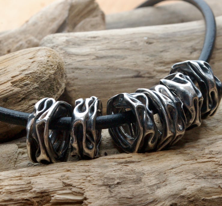 5 beads have been made from sterling silver sheet which has been 'squashed' to form a folded effect. Each bead has then been oxidised and the edges polished to bring out the texture. The beads are strung onto 4mm leather with handmade sterling end caps and an S hook for fastening. An unusual and eyecatching piece of jewellery. Total length 42cm including S hook.