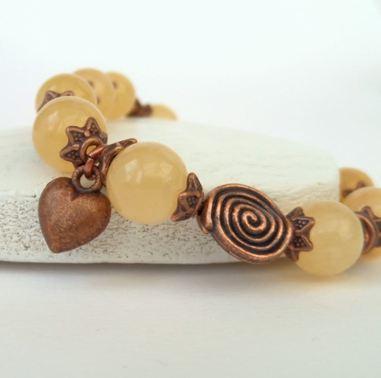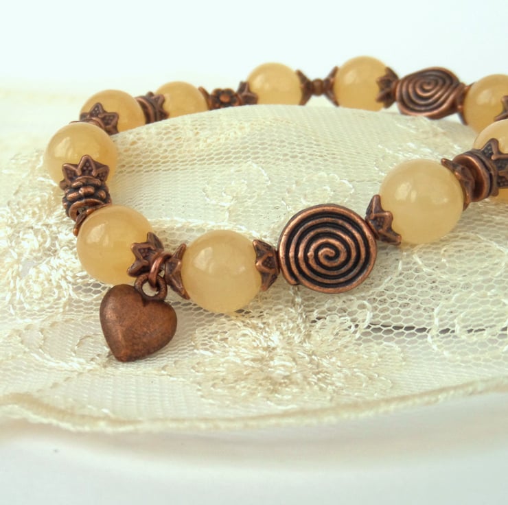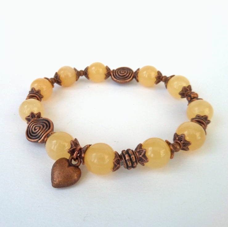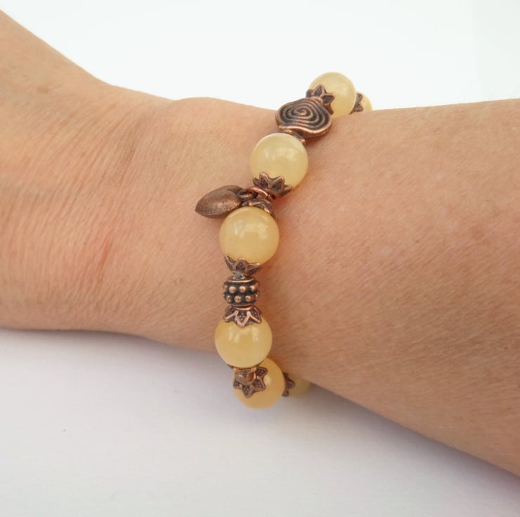 Copper and honey jade combine perfectly in this unique handmade stretchy bracelet.