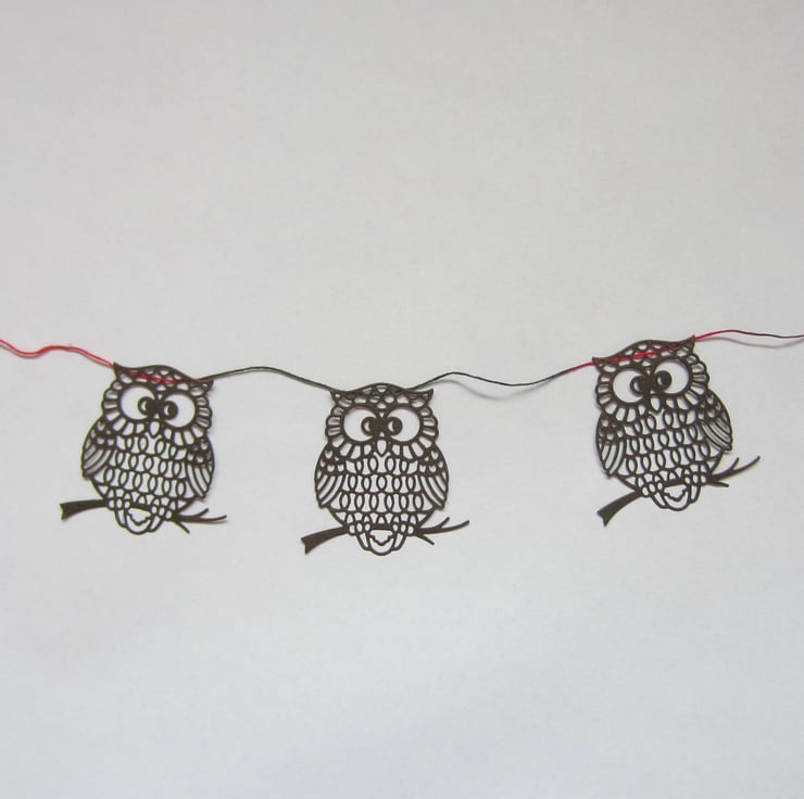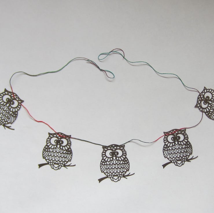 Cute owl bunting measuring 92 cm long. There are 5 owls each made from brown card and measuring 7 x 6.5 cm. They hang on a multi coloured thread with a loop at each end for hanging. Owls can be moved to desired position.