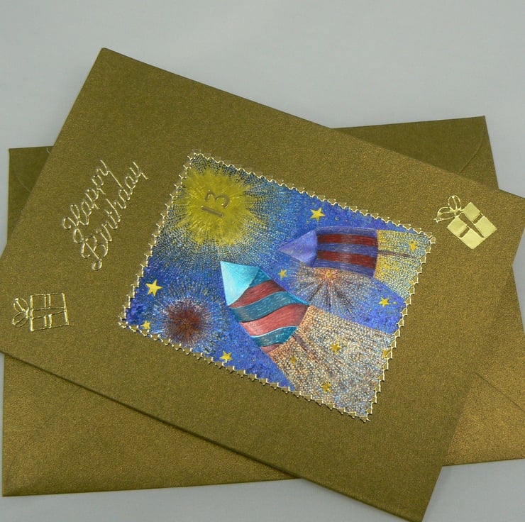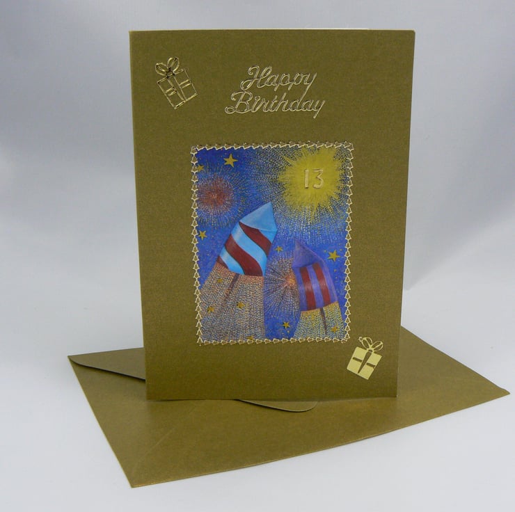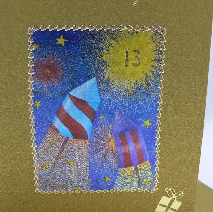 A Dufex foil 13th Birthday card with fireworks on. This card is blank inside for you to write your own sentiment, it comes with matching gold metallic envelope and cellophane bag.Card measures 10.5 cm x 14.8 cm.