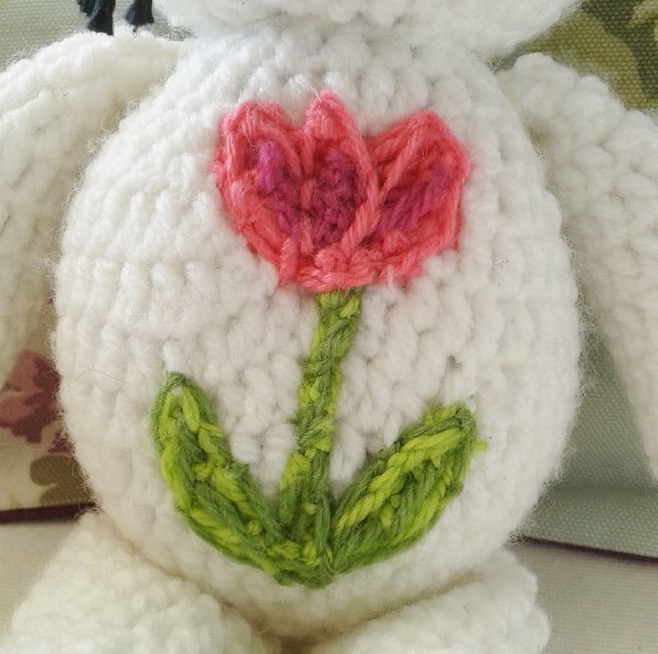 An adorable handmade white bunny rabbit, with a pretty flower applique embroidered on to her tummy. Stands approximately 35 cm tall.