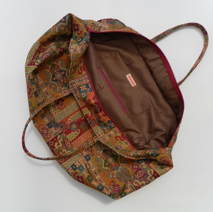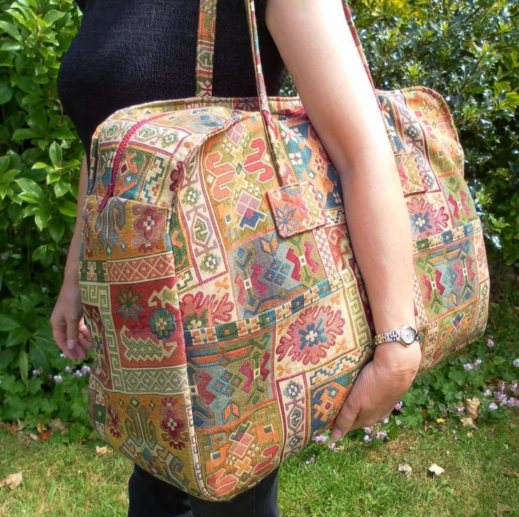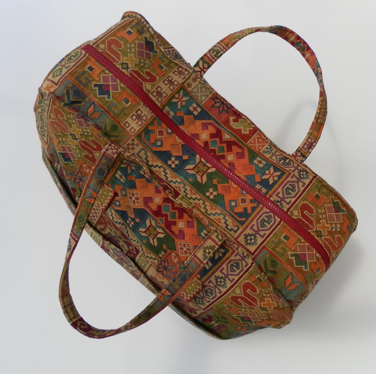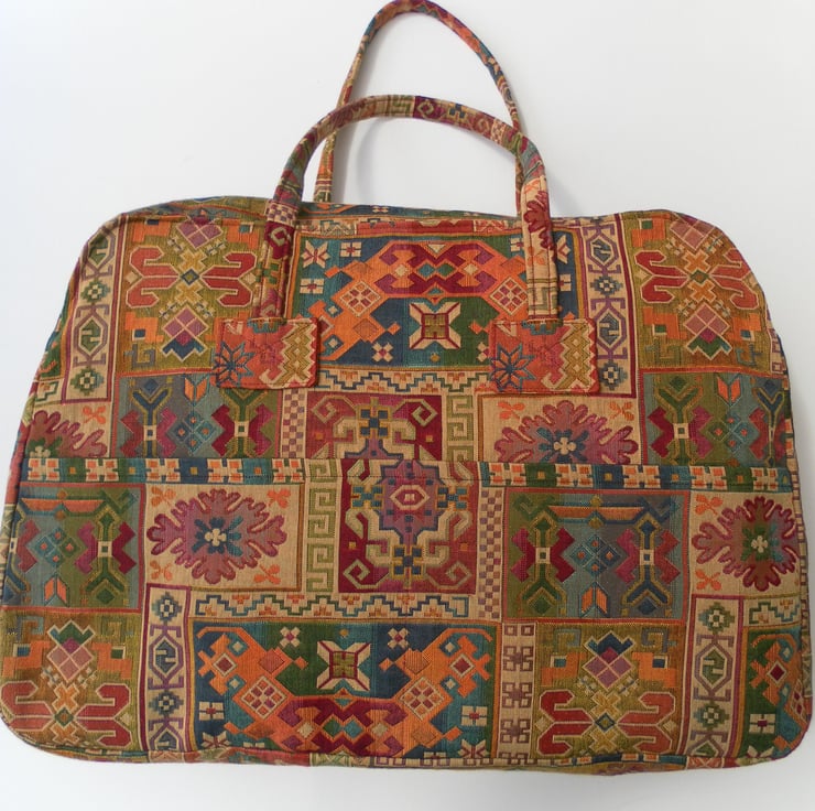 This stylish bag is a one off and would be unique to you! It is a multi use bag and made with size restriction for carry on luggage in mind. It is made from strong brocade with an elaborate multi-coloured design and is fully lined. The bag has two straps, long enough to go over the shoulder if required. It has two slip pockets on the outside and on the inside a secure zip pocket and a slip pocket . The bag has a heavy duty zip. The dimensions of the bag are approximately 53cm x 37cm x 17cm. It weighs approximately 530 grams.
