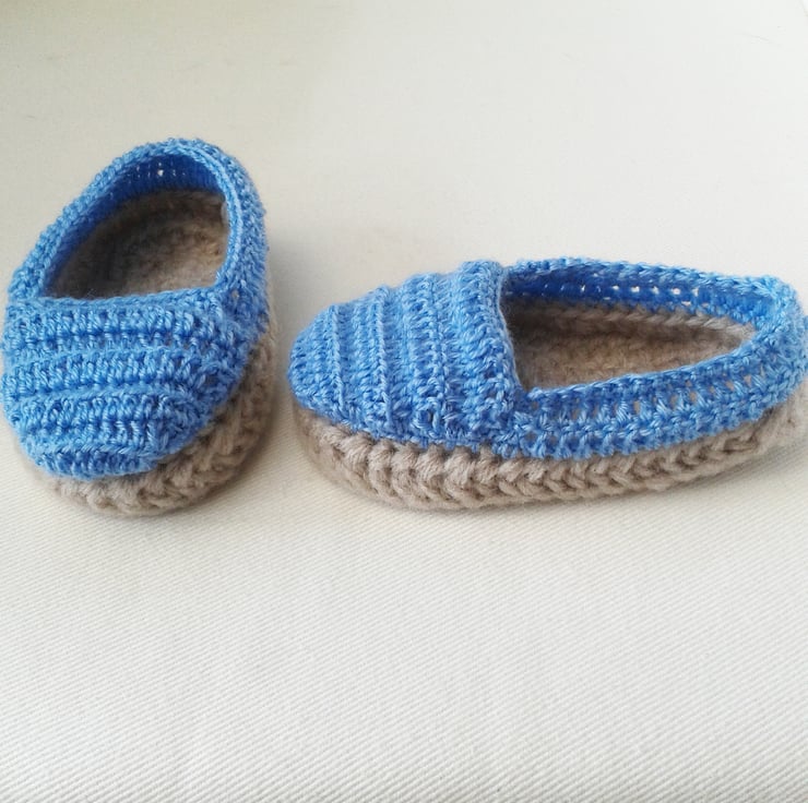A gorgeous, trendy pair of baby espadrilles in oatmeal and medium blue. The perfect unique baby gift and summer accessory, or photo prop! Size approximately 9-12 months (approximately 5 inches)