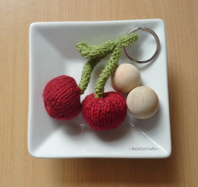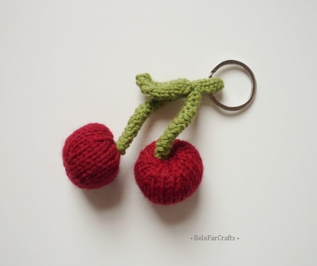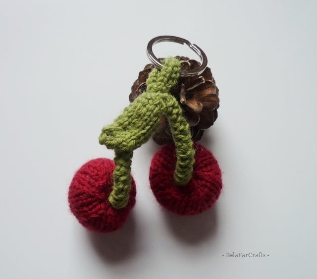 My hand knitted cherries will add charm to your handbag, backpack, gym bag etc. They are attached to a keyring that will not tarnish. The charm is 10cm (4in) long and the cheries measure about 3cm (1.5in) in diameter.