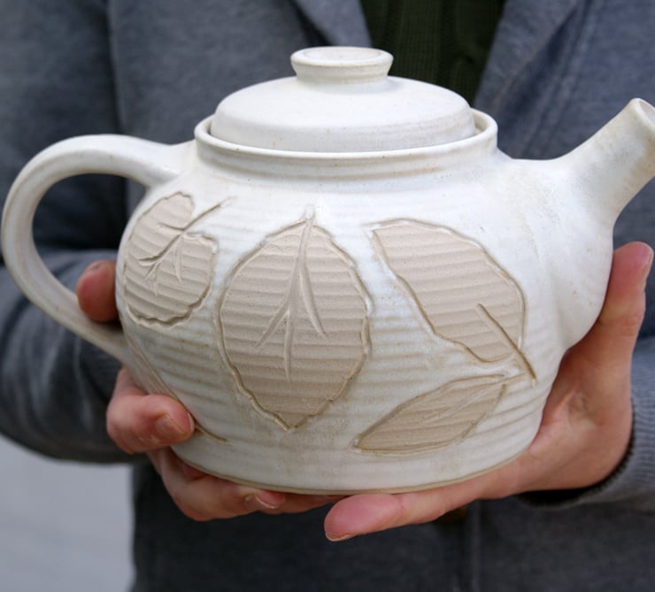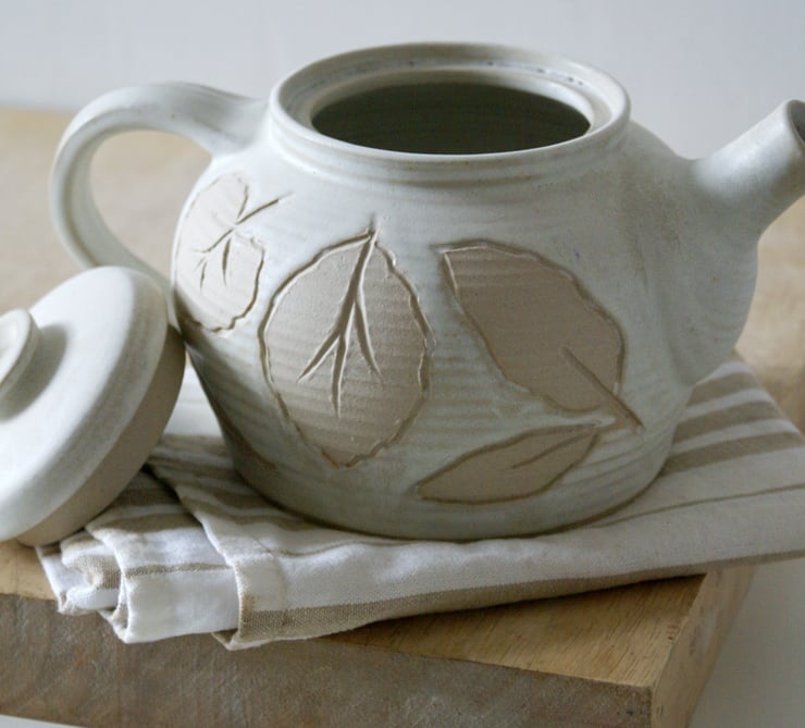 When all the pieces were firm enough I attached them together along with a sturdy pulled handle. The teapot is glazed in vanilla cream which has a soft off white tone and has a mat finish to the touch. The outside of the teapot was also etched with a leaf pattern using real leaves as a template.