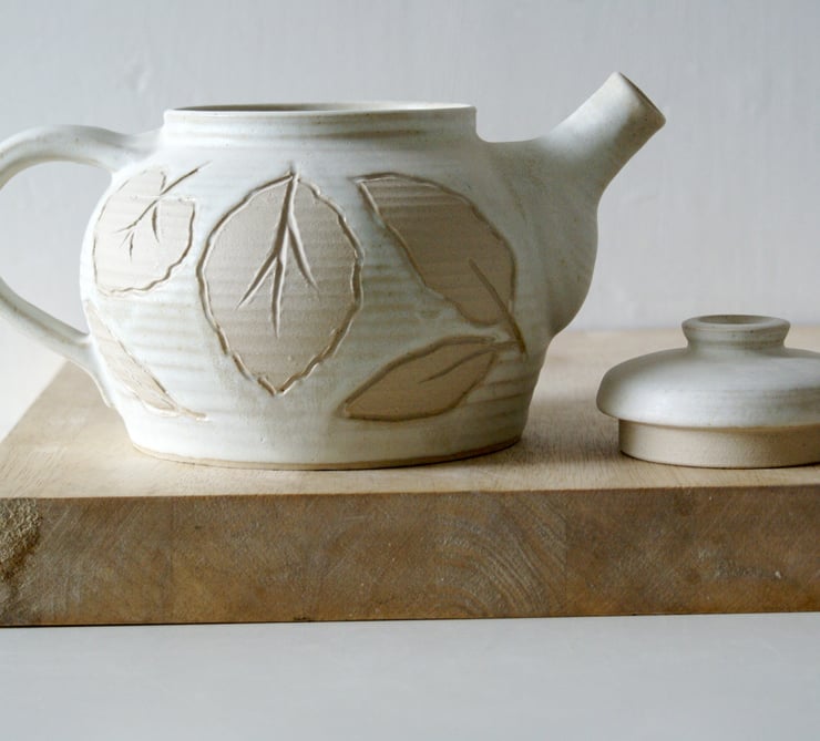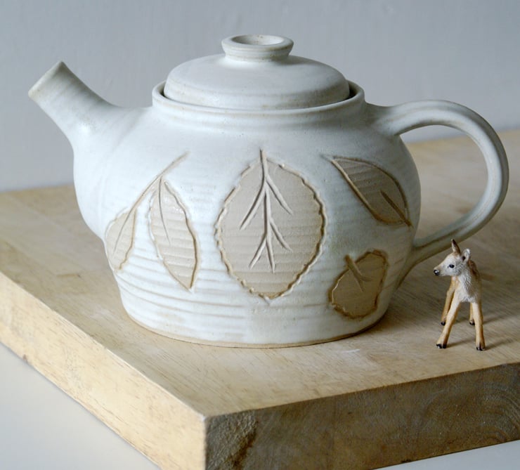 Handmade stoneware teapot with leaf design in vanilla cream. Handmade Stoneware Pottery by littlewrenpottery on Folksy.