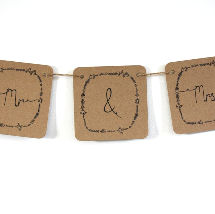 Simple, pretty and rustic Mr and Mrs bunting with hand lettering and a woodland botanical illustrated frame.