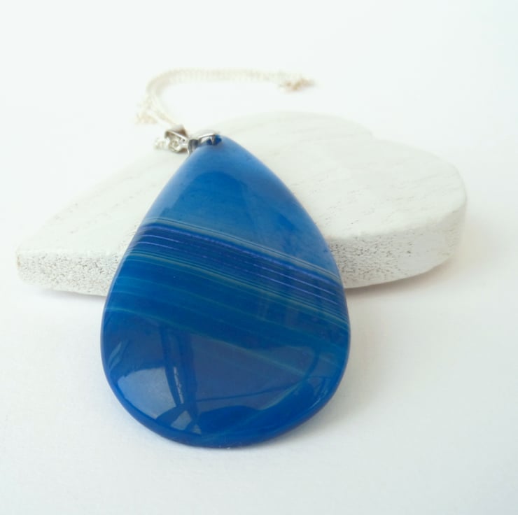 A lovely example of banded agate in this dyed blue pendant necklace.