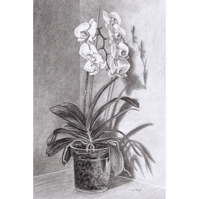 This is a unique original graphite pencil drawing of a white orchid in flower. From the base of long, tough, shiny dark leaves grows a tall stem bearing seven pure white flowers hanging down in a cascade. The flowering orchid in its pot is captured in a soft light which throws a diffused shadow onto the wall behind, perfectly suited to the subtle shades of a graphite pencil drawing.