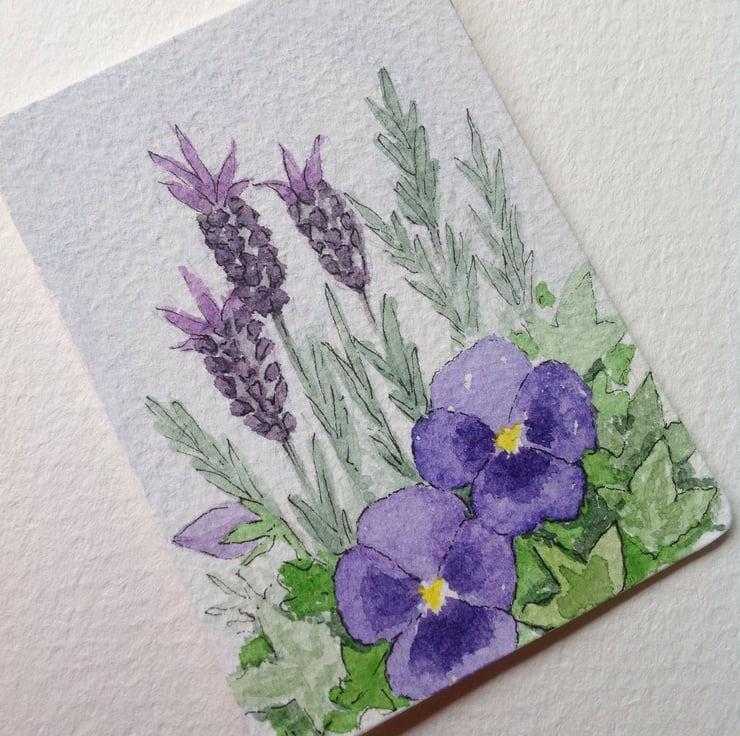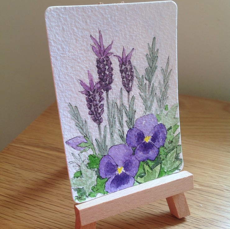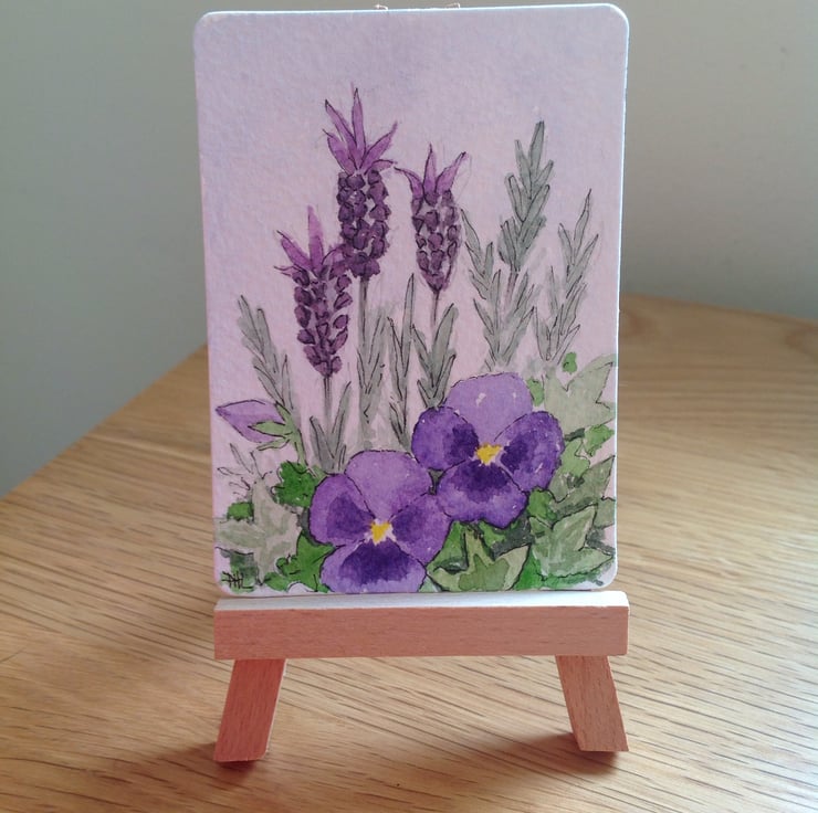 This ACEO is an original watercolour painting of lavender and pansy flowers growing in a barrel in my garden.