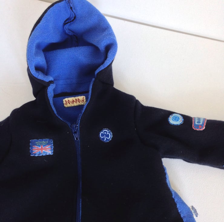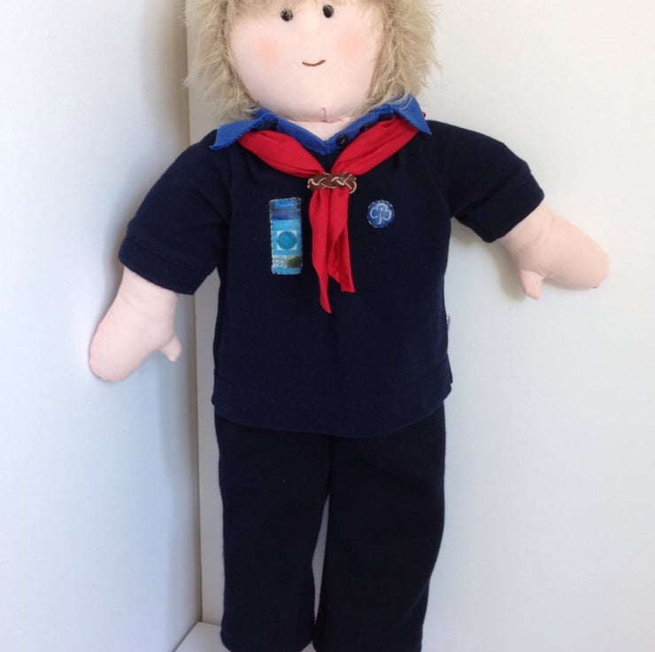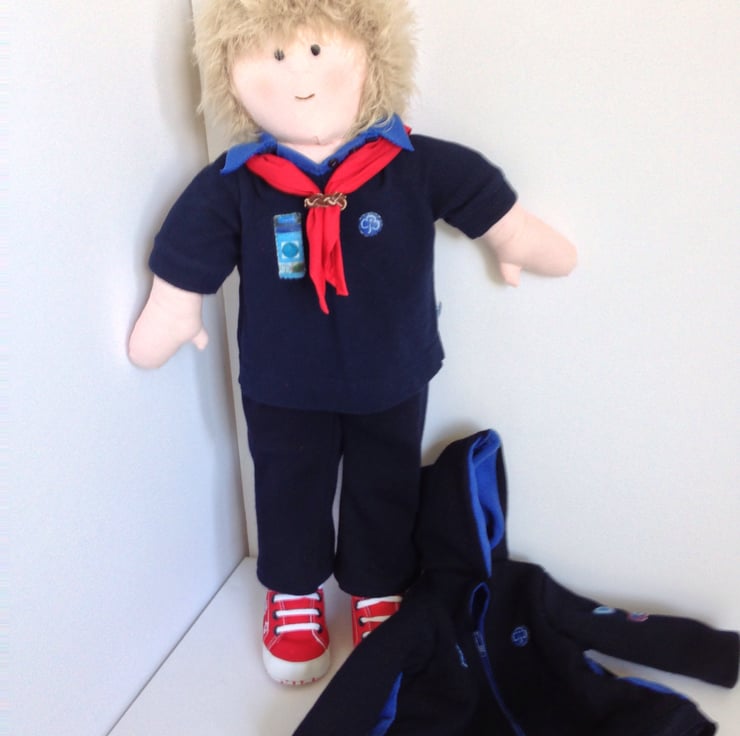 A guide leader doll in her polo shirt and navy sweatpants with matching hoodie. The outfit is complete with badges and a red necktie and trainers. The necktie fastens with a real leather waggle. A special order for Rachel.