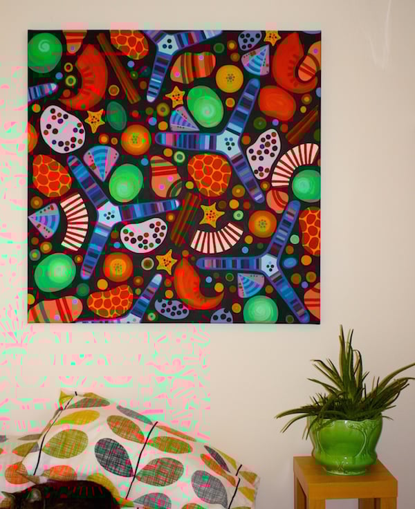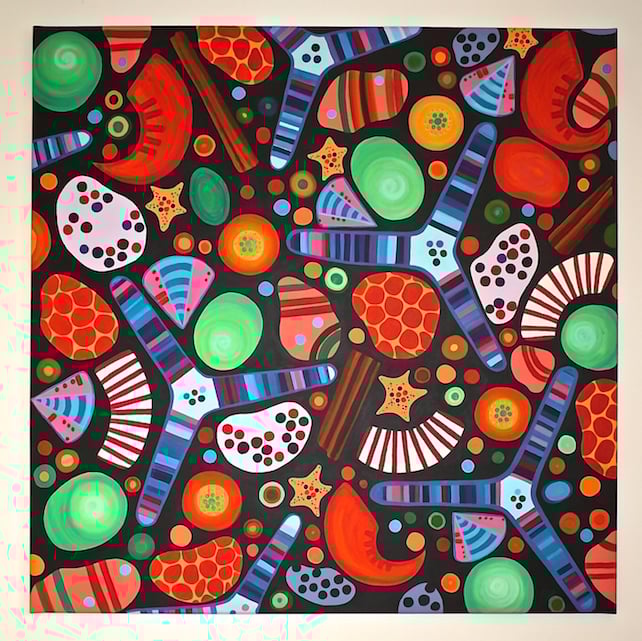 This striking image is based on magnified images of sand grains. I have painted the different grains with acrylics on a very good quality canvas which measures 100cm square. The design goes around the sides of the board too as I prefer this form of presentation. you could frame this canvas if this is your preference.