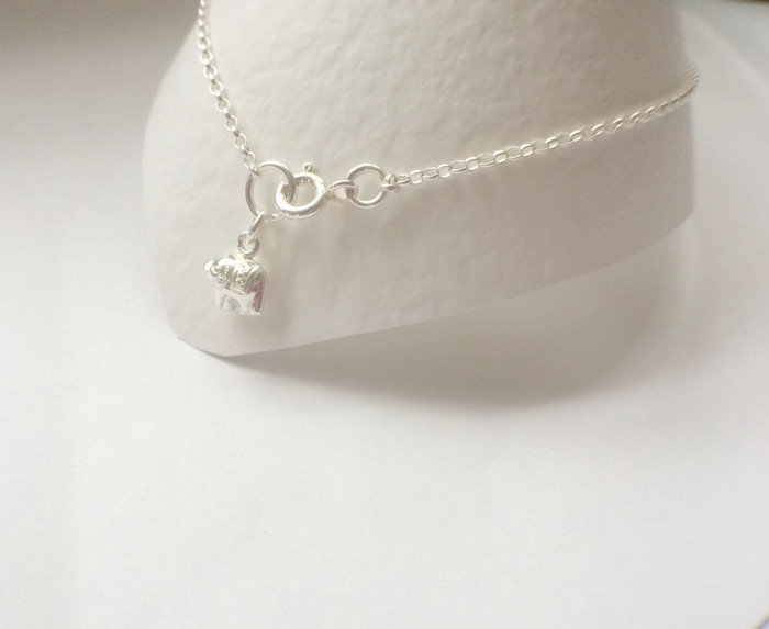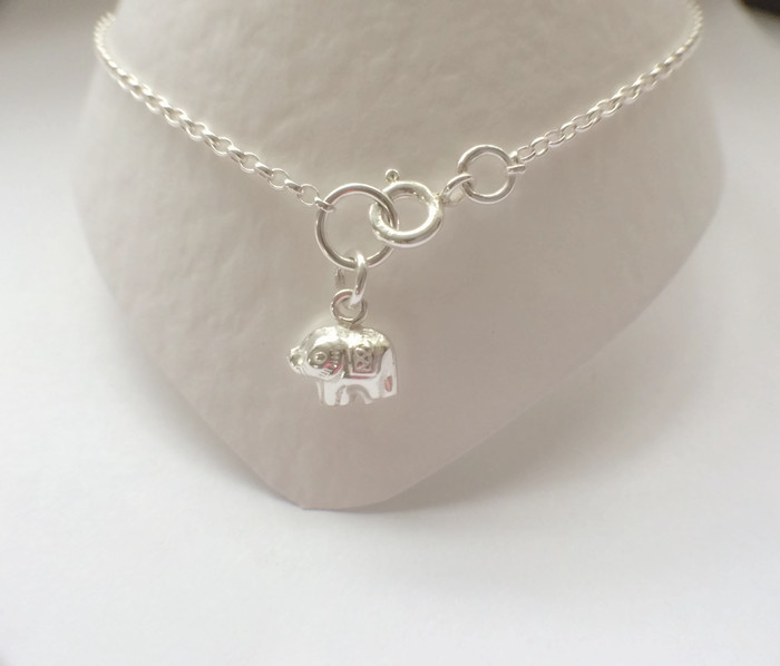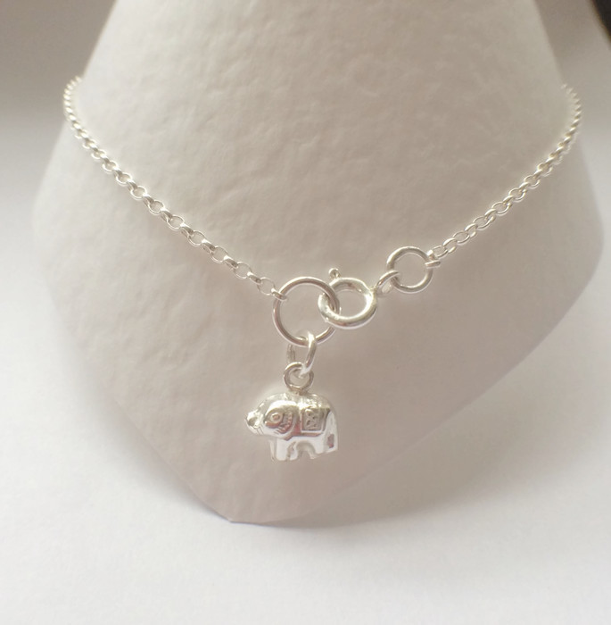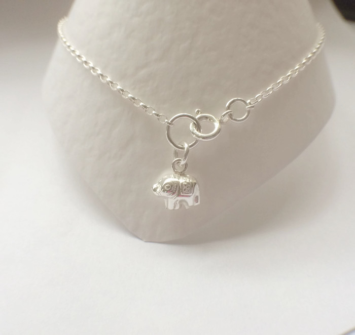 Sterling Silver Ankle Anklet Bracelet Elephant Charm. I made this ankle bracelet using 925 Sterling Silver Belcher oval link chain. The Sterling Silver puffy elephant charm was soldered to the chain and the anklet was finished with a Sterling Silver bolt ring clasp.