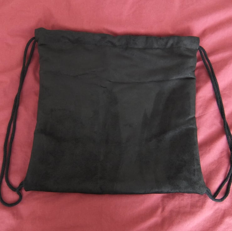 This rucksack is made from black faux suede with black cord draw strings, it has black and pink striped lining. There is a pocket in the lining which closes with a square of Velcro, there is also a square of Velcro to hold the lining closed in the middle.
