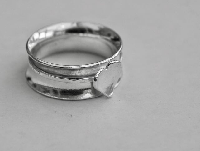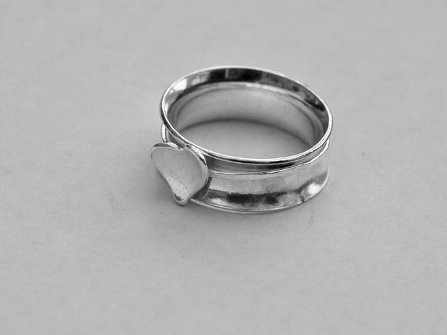 The inner ring is made of 9mm wide sterling silver which has been polished to a high shine. The spinner is made of 1mm sterling silver, textured with a ball-pein hammer. It carries a domed silver heart about 8x7mm in size, firmly soldered to the outer ring and so free to spin. I have just one of these rings in stock at the moment in UK size O. It weighs 4.9g. If you would like a different size, just mail me with your ring size and allow a few days extra for it to be made up as a custom order. There may be small individual variations.