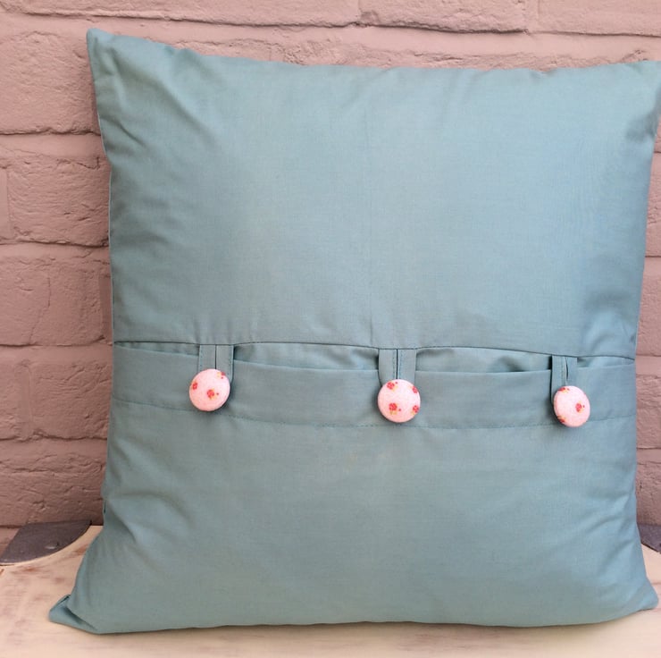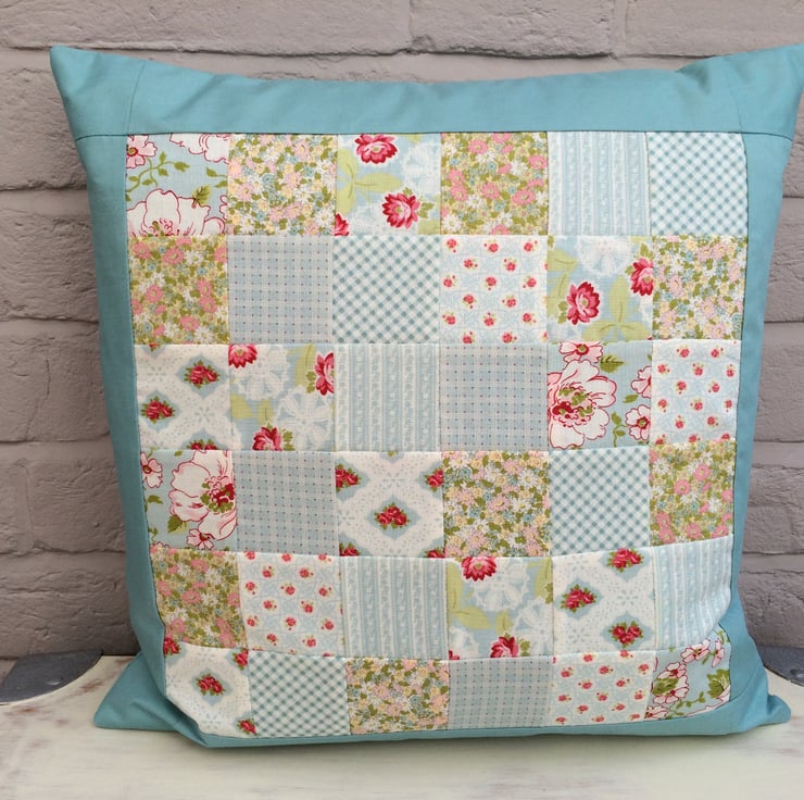 A 16" (40cm) square patchwork cushion made from 36 x 2" squares in shades of pink and duck egg blue. The borders and backing are made from a plain duck egg blue cotton and there are three loop and covered button closures at the centre back.