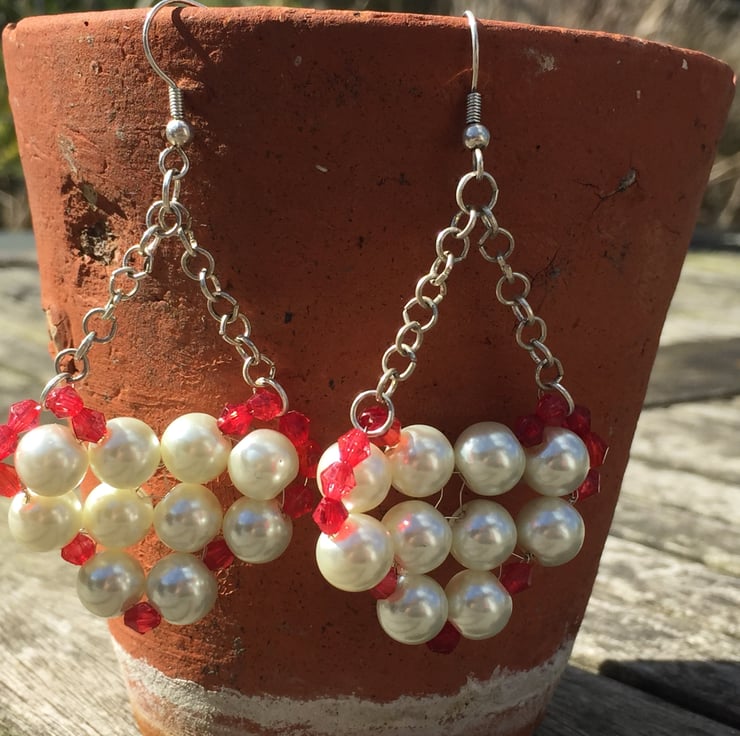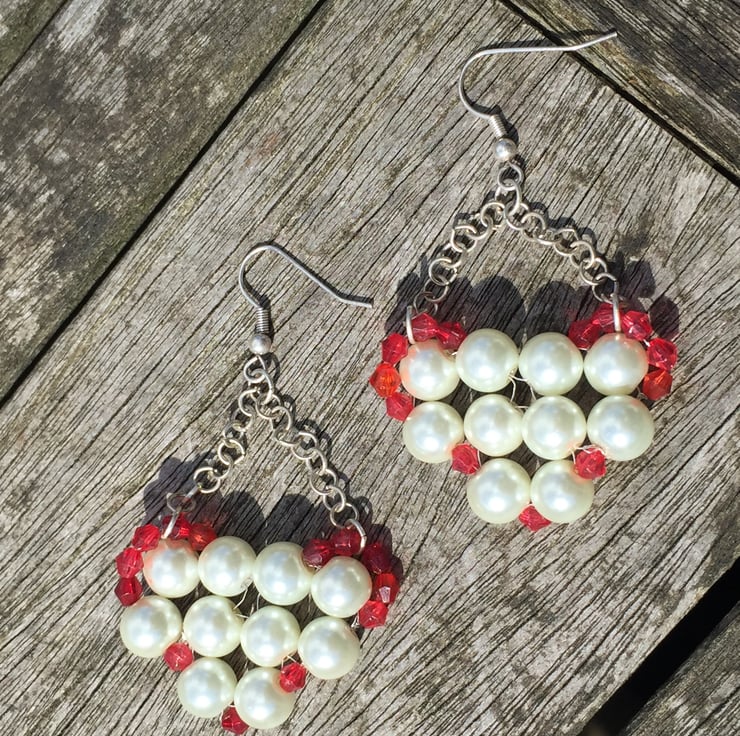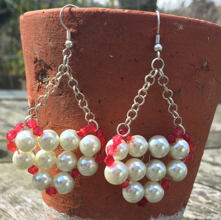White glass pearls and red plastic beads knitted to make large heart shape. Hung on silver plated chain and silver plated earring hook.