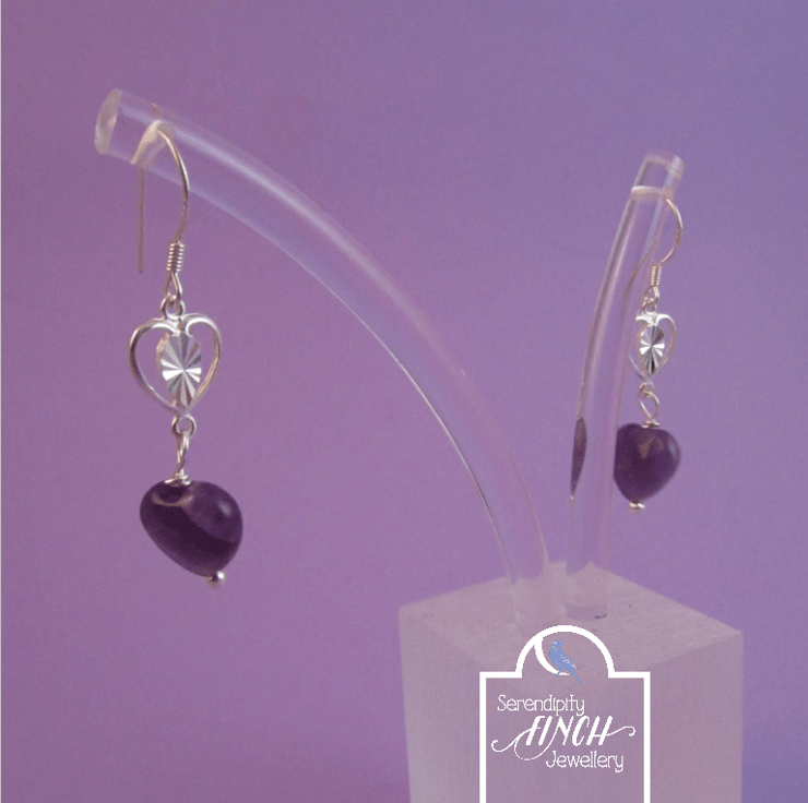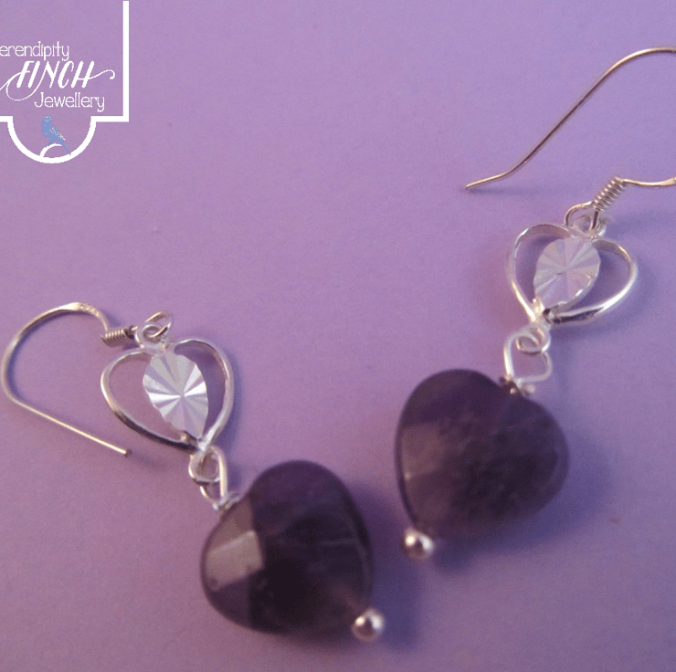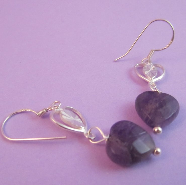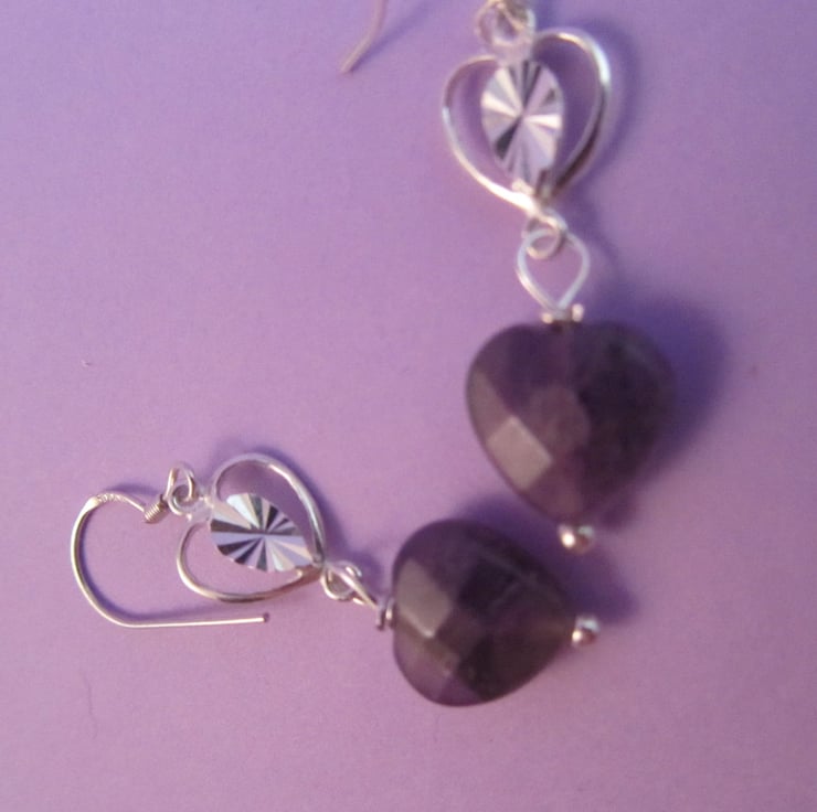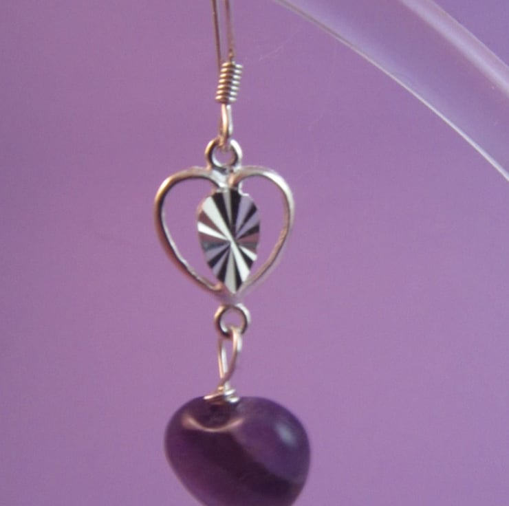 This is a pair of gorgeous purple amethyst heart silver earrings. They are created using real faceted amethyst heart gemstones and silver. They are beautiful and would add a touch of sophistication to any outfit.