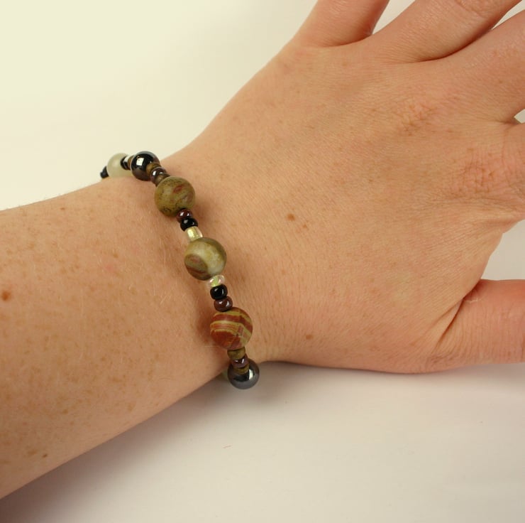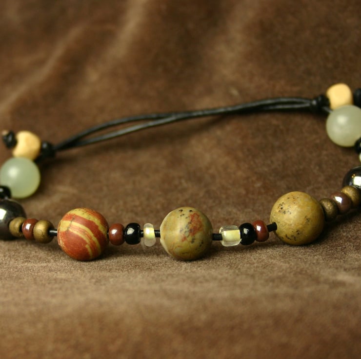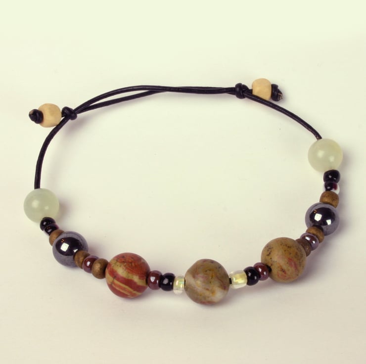 Using a mixture of beautiful stone beads with glass, wood and others, these earthy bracelets are adjustable to fit your wrist size using a slip knot in the leather thong. Each one is unique, with much thought given to color combinations, bead size and even the type of leather thong used to string them. Made by my other half :) The bracelet pictured is the one that you will be sent.