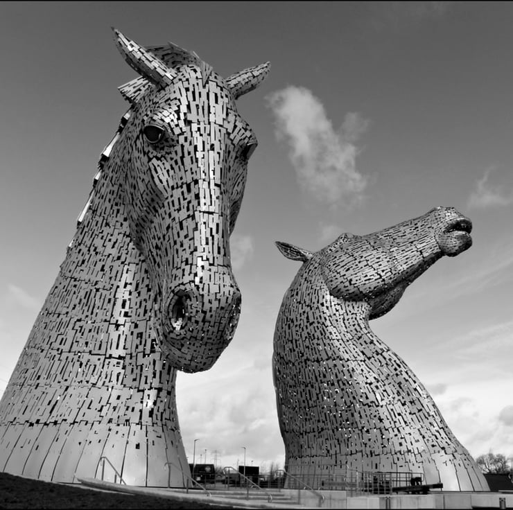 I love photographing sculptor Andy Scott's work and this is his latest piece which has really taken the public imagination by storm, a pair of giant 'Kelpies' which soar majestically out of the landscape near Falkirk. I think his fantastic metalwork suits black and white photography - see my other photo of his 'Heavy Horse' sculpture