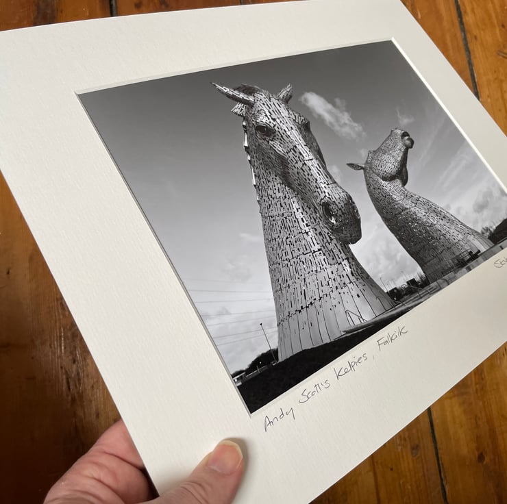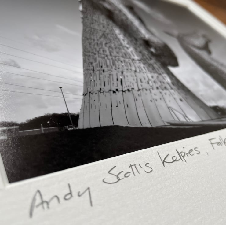 An original hand-signed mounted print of the iconic new Kelpies sculptures by Andy Scott near Falkirk
