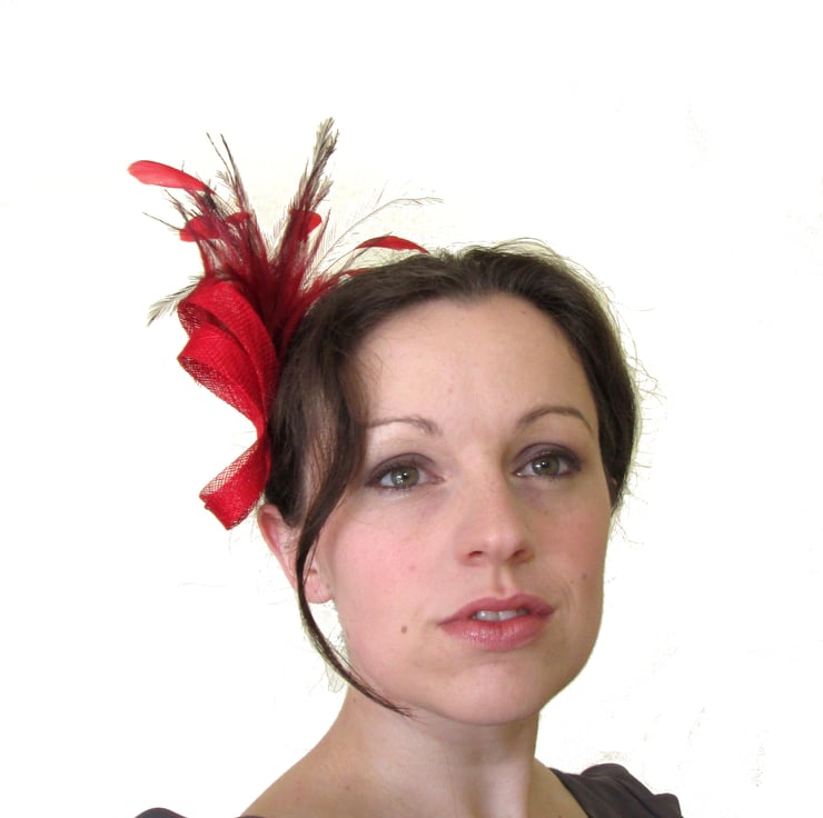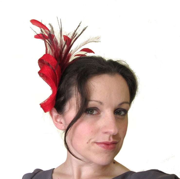 Handmade hair piece featuring swirls of sinamay and spray of feathers. This glamorous red fascinator would be perfect for bridesmaids, proms or formal meetings. Measuring approximately 20cm in length (swirls are 10cm high), this petite headpiece comes beautifully presented in its own hatbox to keep it safe and dust free.