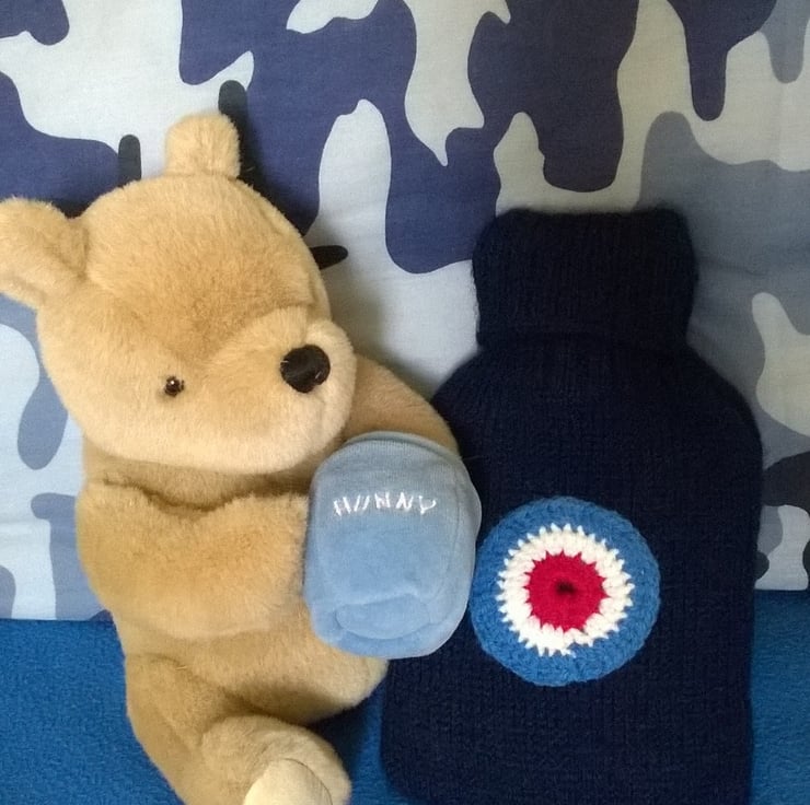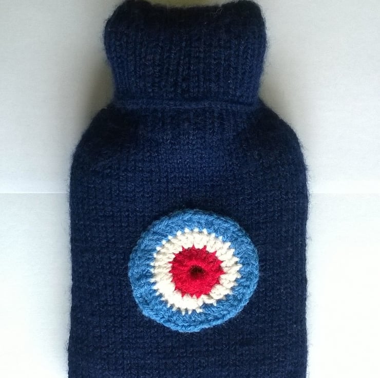 Navy blue hand knitted hot water bottle cover, with a crocheted RAF style roundel appliqued on the front.