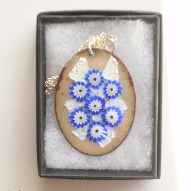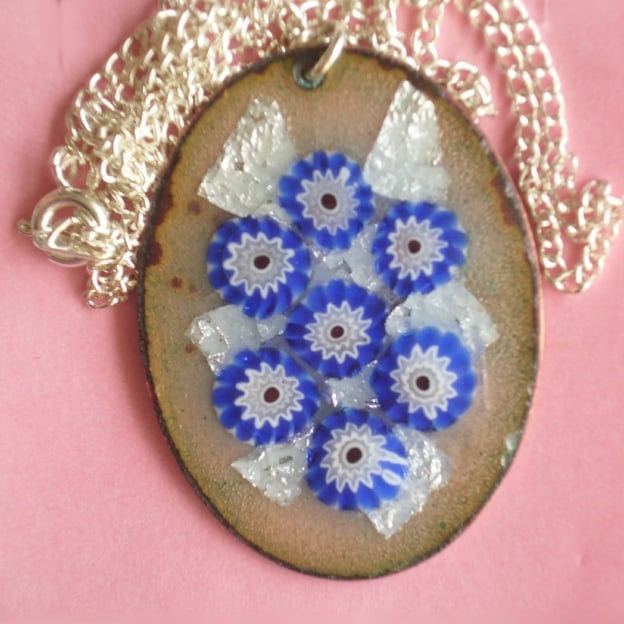 This pendant is made with millefiore beads and silver foil over copper.