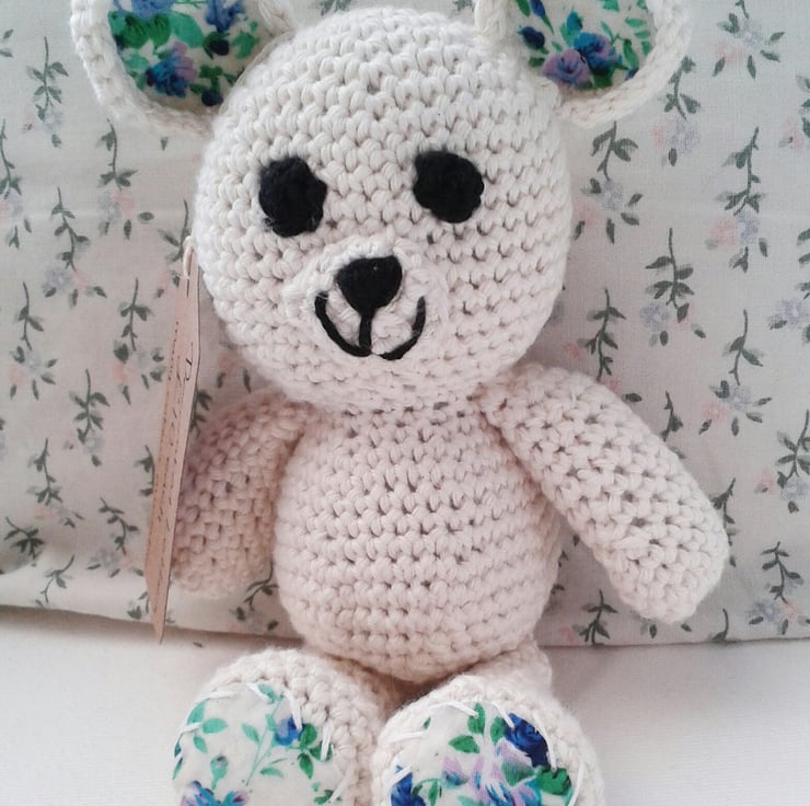 An adorable made-to-order premium "Cuddle Bear" (named Sophia by the lovely customer who first chose the colours). Made in 100% cotton ivory wool with blue floral fabric accented ears and soles.