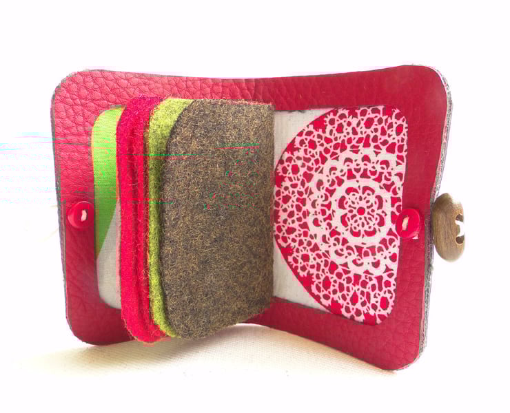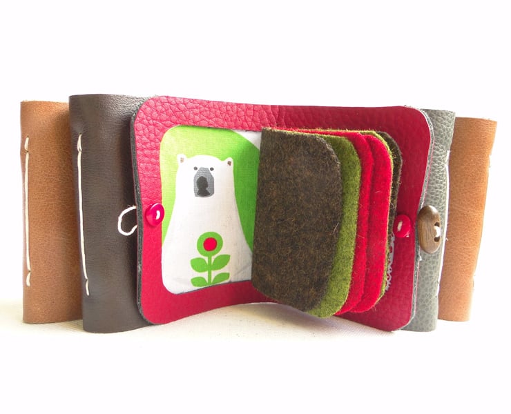Keep them together in this red imitation leather case, measuring 9cm x 7xm with a polar bear, scandinavian fabric interior and six separate 'pages' for needle storage in brown, red and green felt. Fastened with a toggle button.