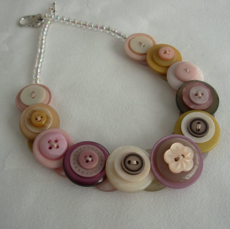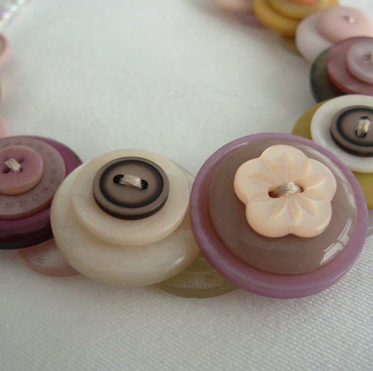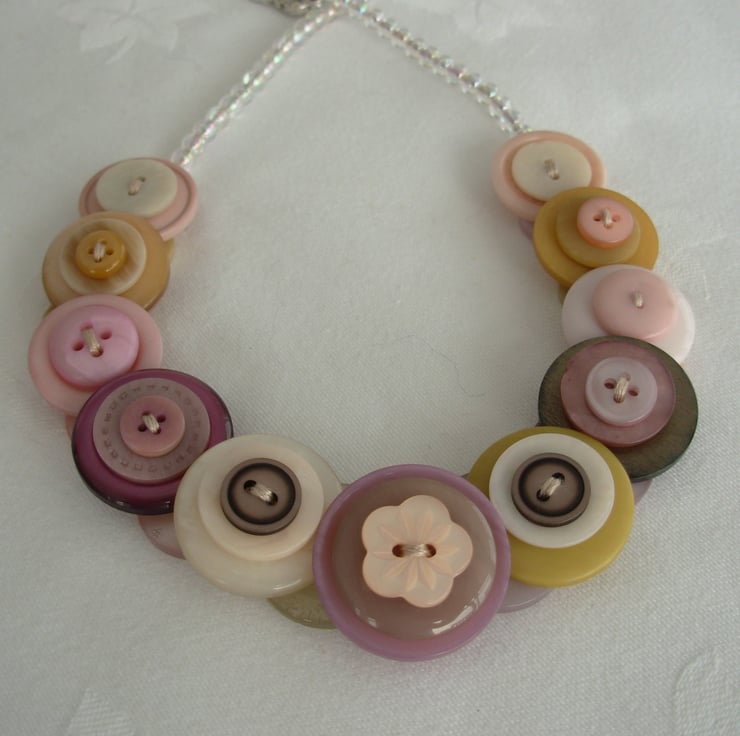Handmade layered and stacked button necklace - Vintage Flower Garden - pale dusky pinks, lemon, mustard, taupe and cream coloured buttons threaded and knotted with 6 strands of embroidery thread and finished with little clear AB beads and toggle clasp - 16ins (41cm) long - Made to my own individual design - Comes with its own little organza bag