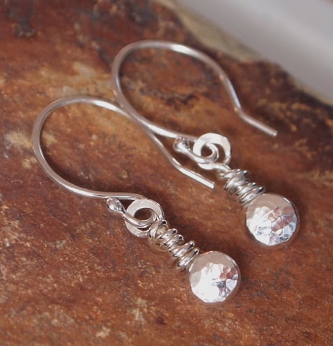 Little pebbles of recycled silver hang by a twist from handmade ear wires to form these great little everyday earrings. The little pebbles have been hammered to add texture and sparkle and the earrings have been burnished to give them a bright shine.