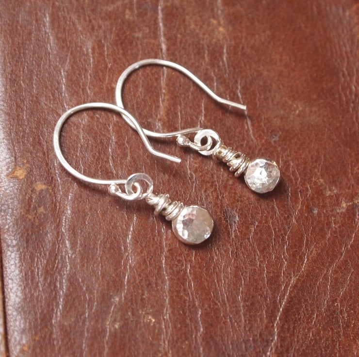 I recycle all my offcuts of silver and like to make these little hammered silver pebbles to incorporate into my designs. I also have stud earrings in stock that look great with these drop earrings in a row of piercings.