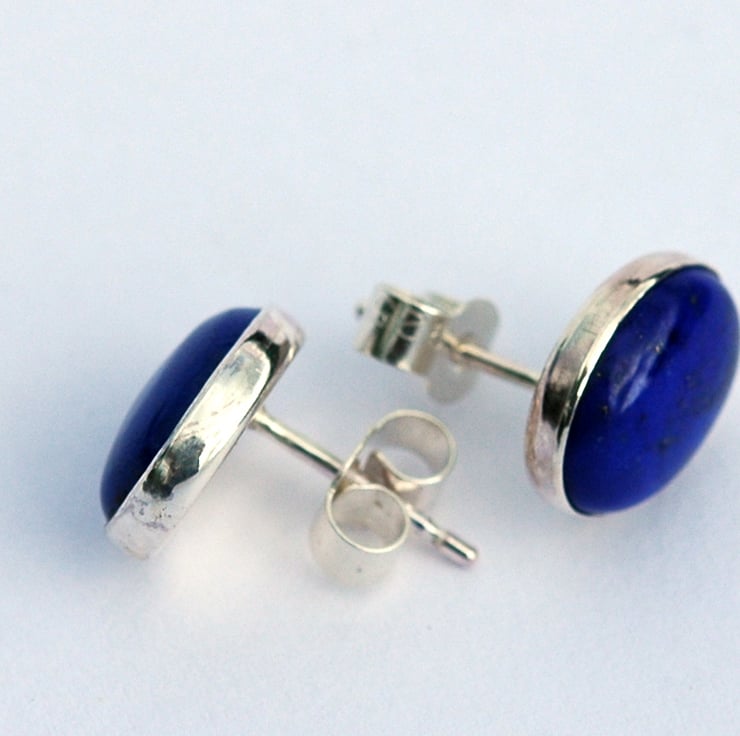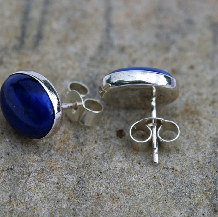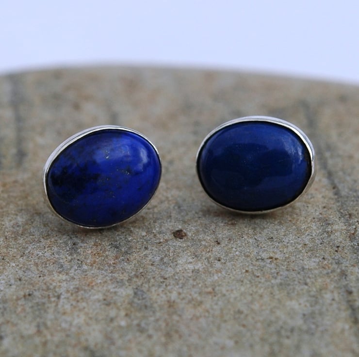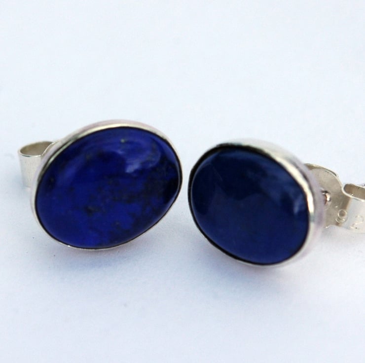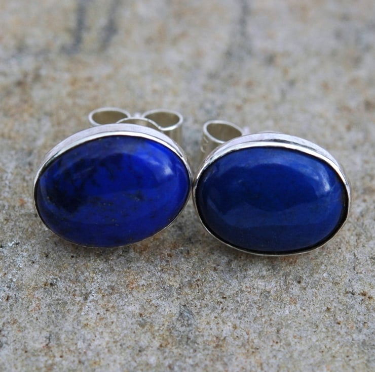 These gorgeous sterling silver stud earrings feature oval cabochons of Lapis lazuli, set within sterling silver bezel cups. Lapis is a beautiful deep blue opaque stone, flecked with goden inclusions of Pyrite. It is a birthstone for September. The size of the stones is 10x8mm. Sterling silver ear posts have been soldered securely to the back of the cups and I have added neat butterfly scrolls, stamped '925' to indicate the purity of the silver. The earrings have been polished to a high shine.
