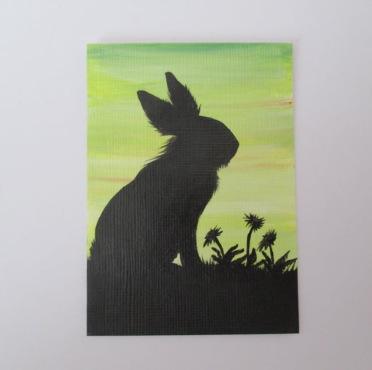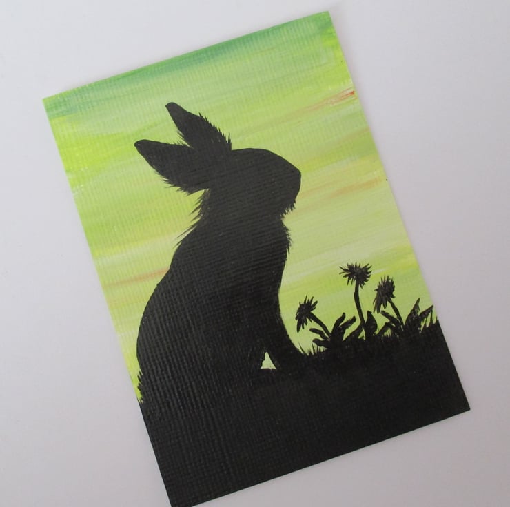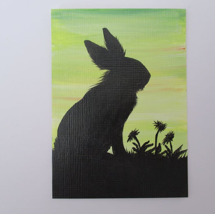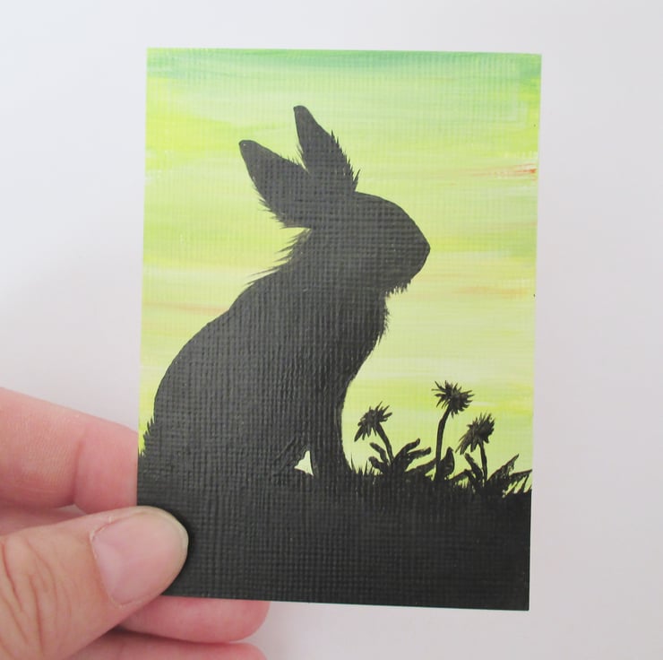 ACEO Bunny Rabbit Lionhead Silhouette with Green Yellow Sky Original Painting