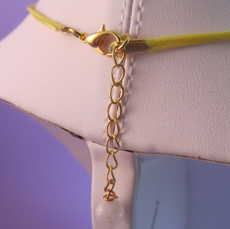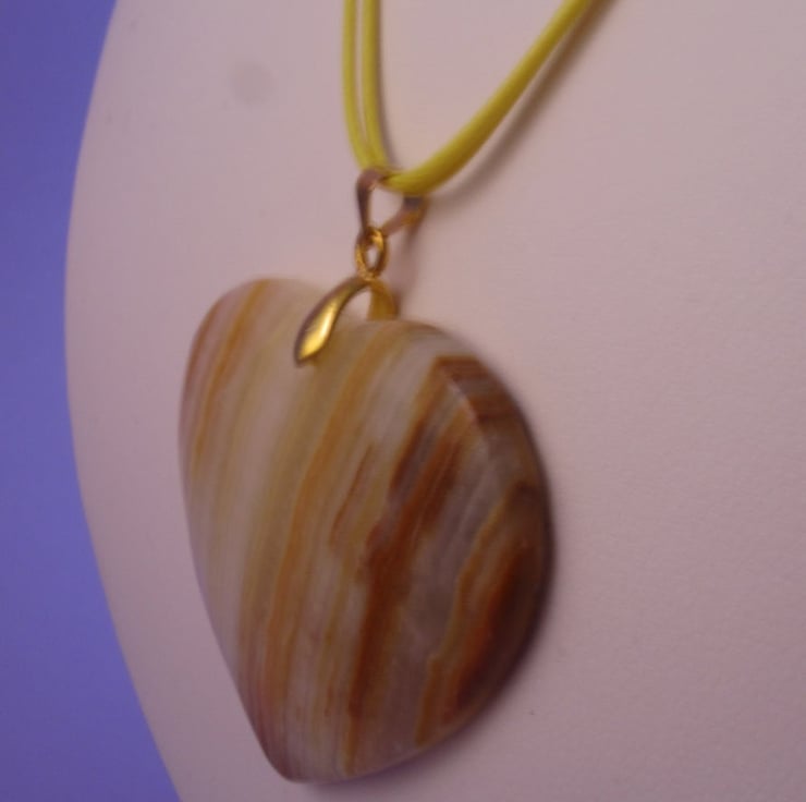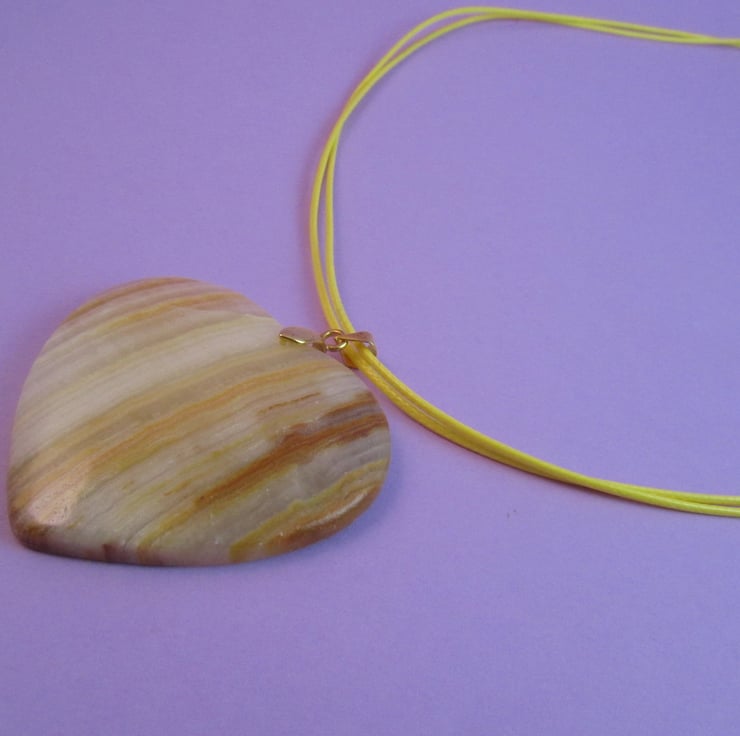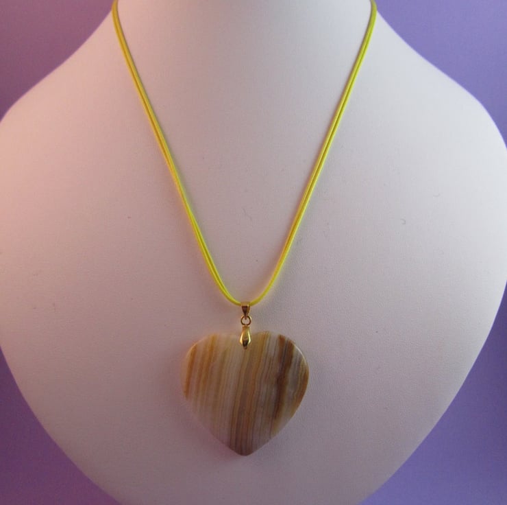 This is a gorgeous Yellow Striped Agate heart pendant necklace. It is created with a real yellow striped agate heart gemstone, gold plated brass, gold plated copper, yellow waxed cord and a real white agate gemstone on the extender. This is so cute, and would really go with jeans or any casual wear.