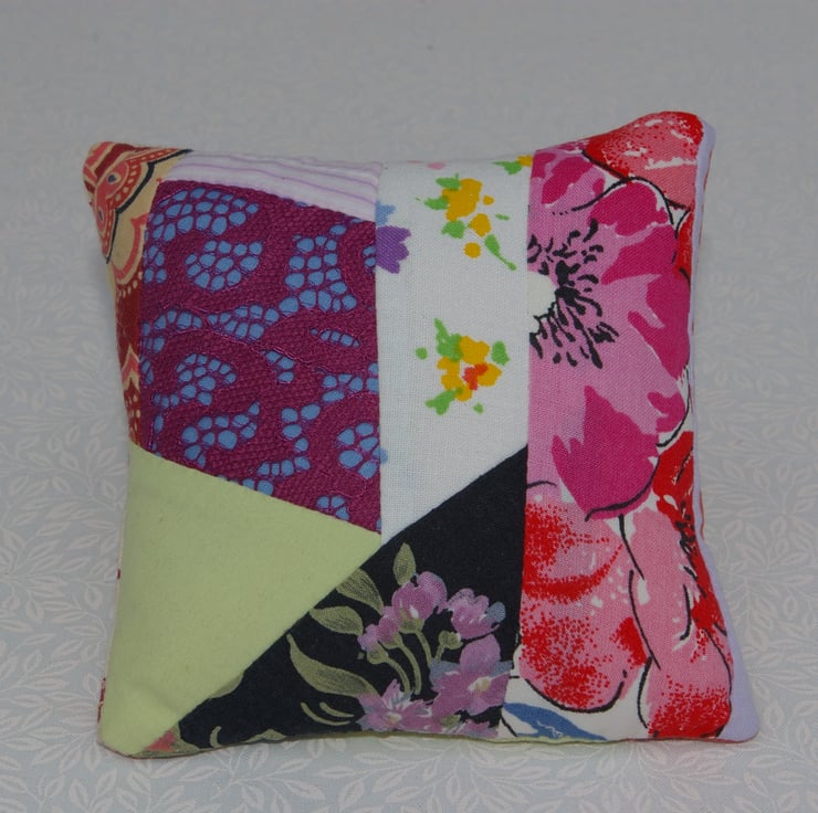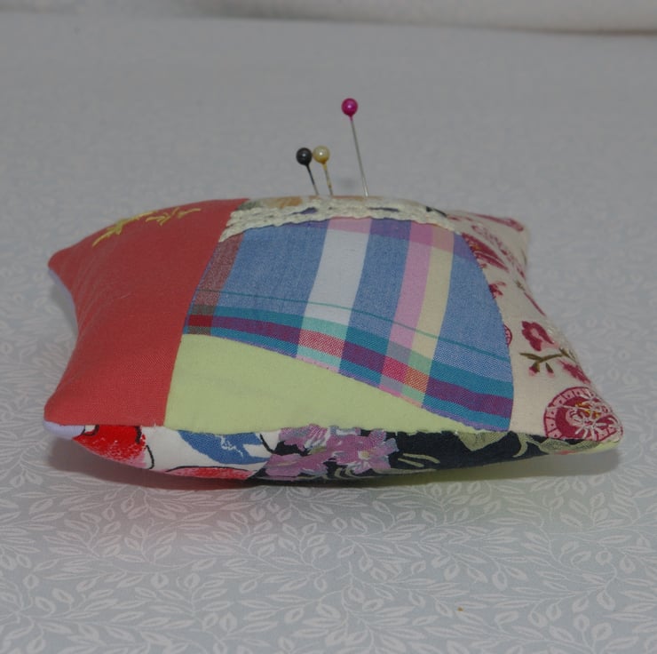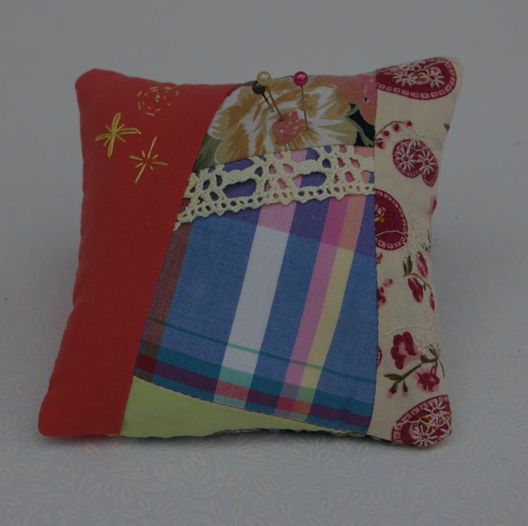 A pretty pin cushion created in crazy patchwork. I have added some rustic crewel embroidery in yellow embroidery floss and a piece of yellow cotton Bedfordshire Bobbin Lace which was created on my lace pillow. There is a mixed variety of cotton and polyester-cotton fabrics used to create this pin cushion. The patterns of the fabrics used are a variety of floral, checks, stripes and plain colour blocks.