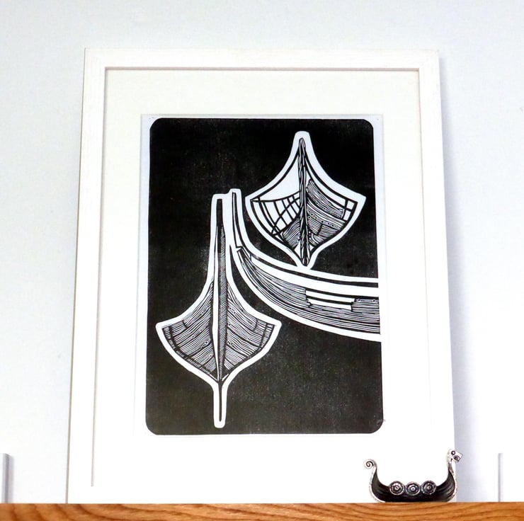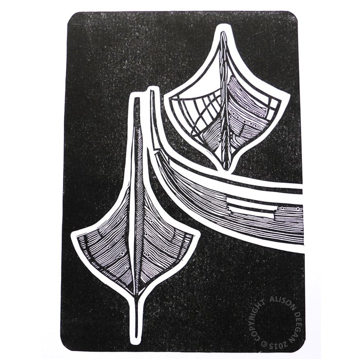 This is an original lino cut print (limited edition of 10 in this colour). Printed from a hand-cut lino plate in BLACK oil-based but water washable inks onto bright white Masa paper. The printed area is approximately 30x20cm and the print is supplied in a white mount to fit a 30x40cm frame. These items are hand-printed and so vary slightly depending on ink density, character of the paper, pressure of the press and the way the wind blows (ok, maybe not the last bit).