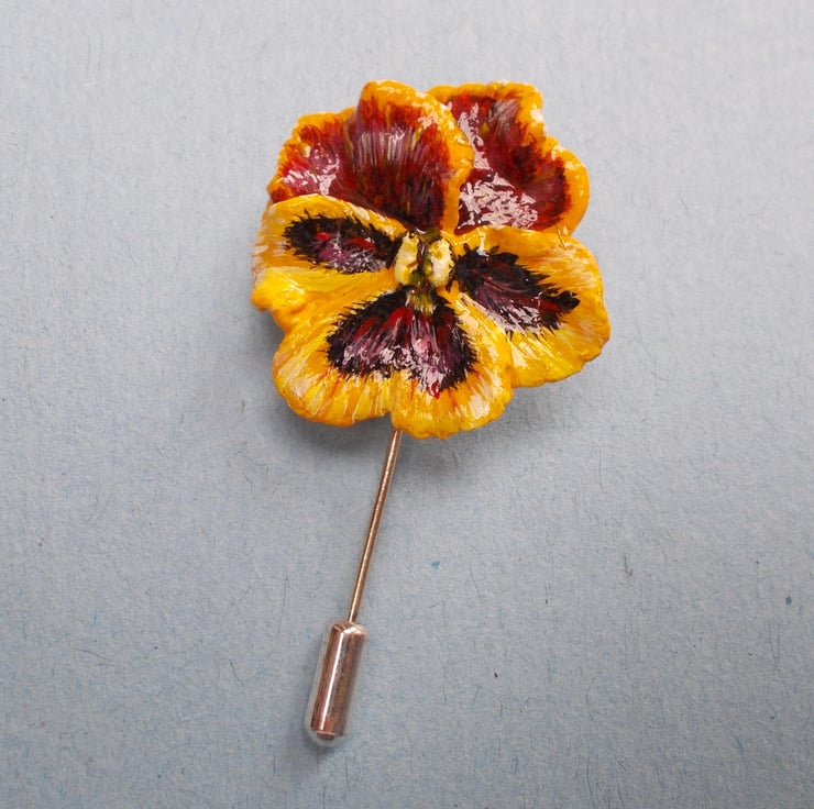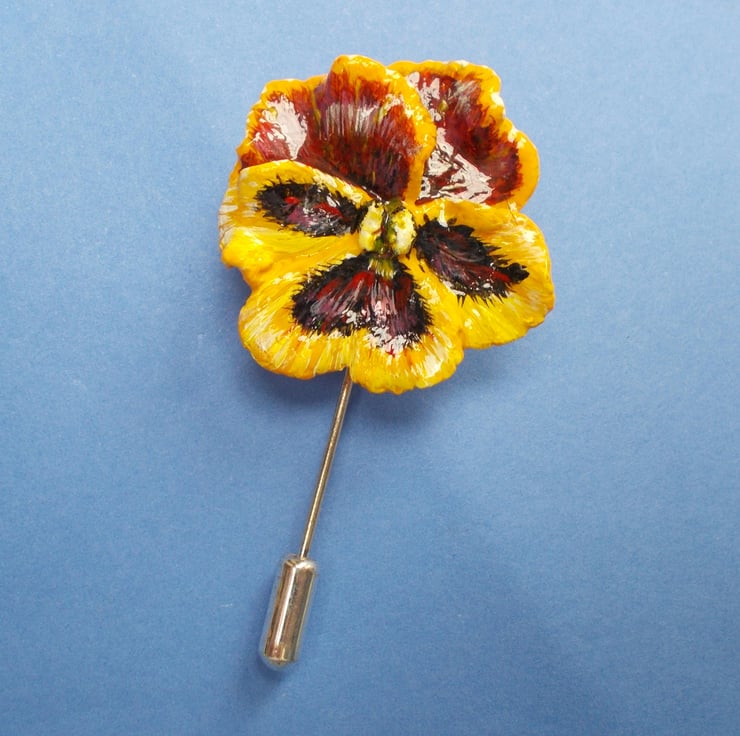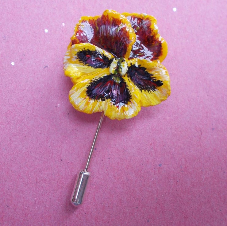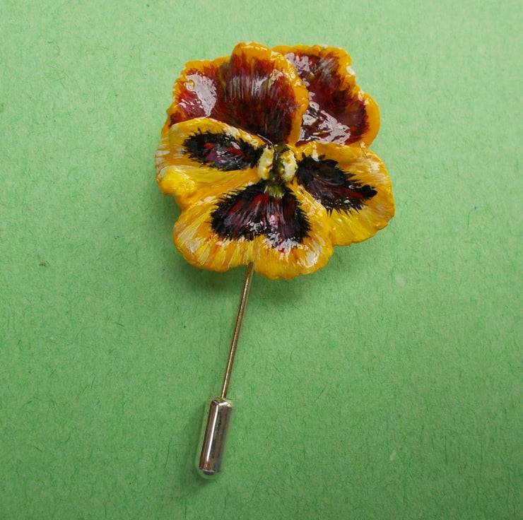 You are looking at a variation of one, of my more unusual Designs. A symbol of "Remembrance"- The YELLOW PANSY STICK PIN- Lapel Flower Brooch