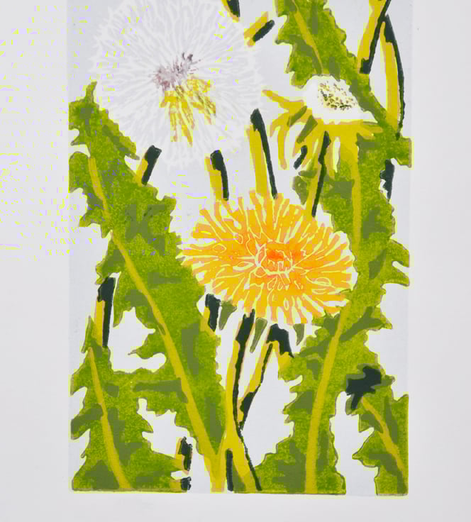 An open edition six colour Lino print of Dandelions. Printed on 210 gsm weight Zerkall printing paper using water based ink.