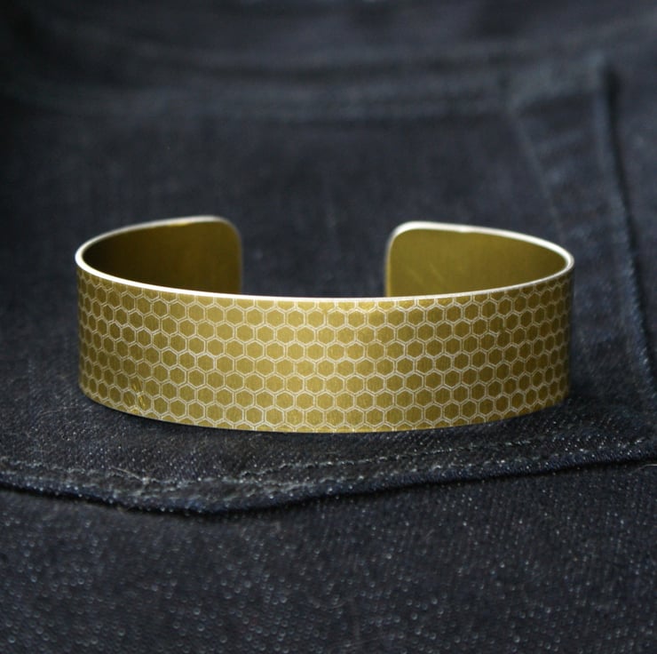 A stylish cuff made from anodised aluminium with a mini honeycomb print. I drew this pattern digitally, made it into a resist and applied it to the metal. I then dye the aluminium, seal it and remove the resist which leaves the pattern showing in the original colour of the metal. The cuff is then made using traditional metalworking techniques.